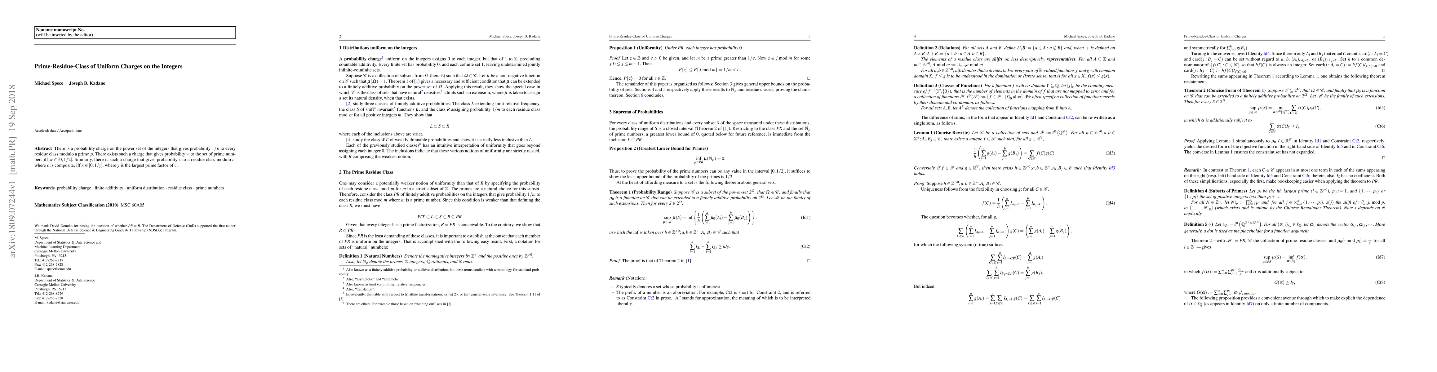 There is a probability charge on the power set of the integers that gives probability $1/p$ to every residue class modulo a prime $p$. There exists such a charge that gives probability $w$ to the set of prime numbers iff $w \in [0,1/2]$. Similarly, there is such a charge that gives probability $x$ to a residue class modulo $c$, where $c$ is composite, iff $x \in [0,1/y]$, where $y$ is the largest prime factor of $c$.