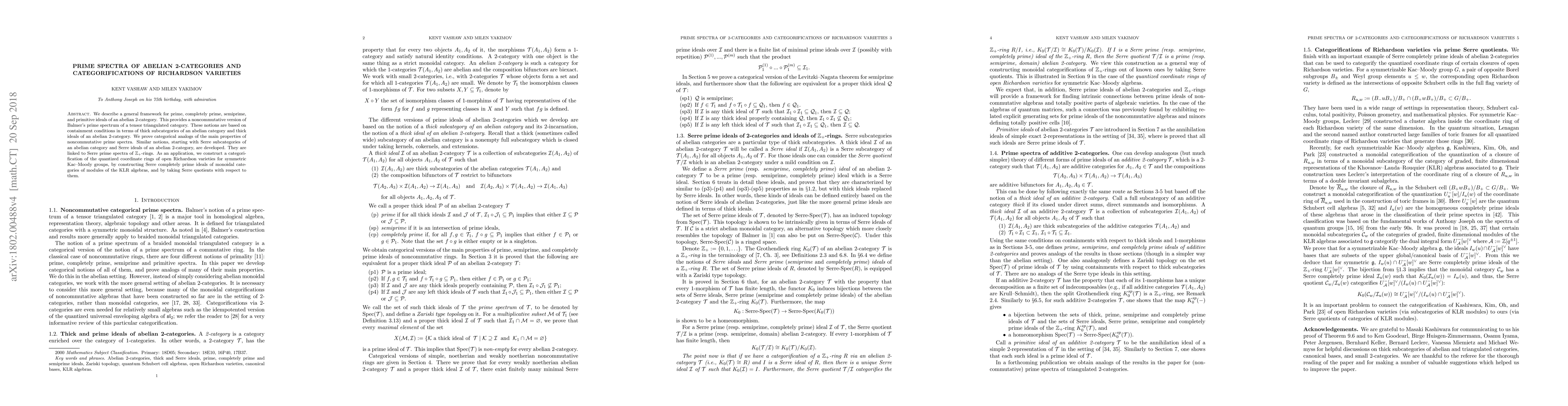 We describe a general framework for prime, completely prime, semiprime, and primitive ideals of an abelian 2-category. This provides a noncommutative version of Balmer's prime spectrum of a tensor triangulated category. These notions are based on containment conditions in terms of thick subcategories of an abelian category and thick ideals of an abelian 2-category. We prove categorical analogs of the main properties of noncommutative prime spectra. Similar notions, starting with Serre subcategories of an abelian category and Serre ideals of an abelian 2-category, are developed. They are linked to Serre prime spectra of $\mathbb{Z}_+$-rings. As an application, we construct a categorification of the quantized coordinate rings of open Richardson varieties for symmetric Kac-Moody groups, by constructing Serre completely prime ideals of monoidal categories of modules of the KLR algebras, and by taking Serre quotients with respect to them.
