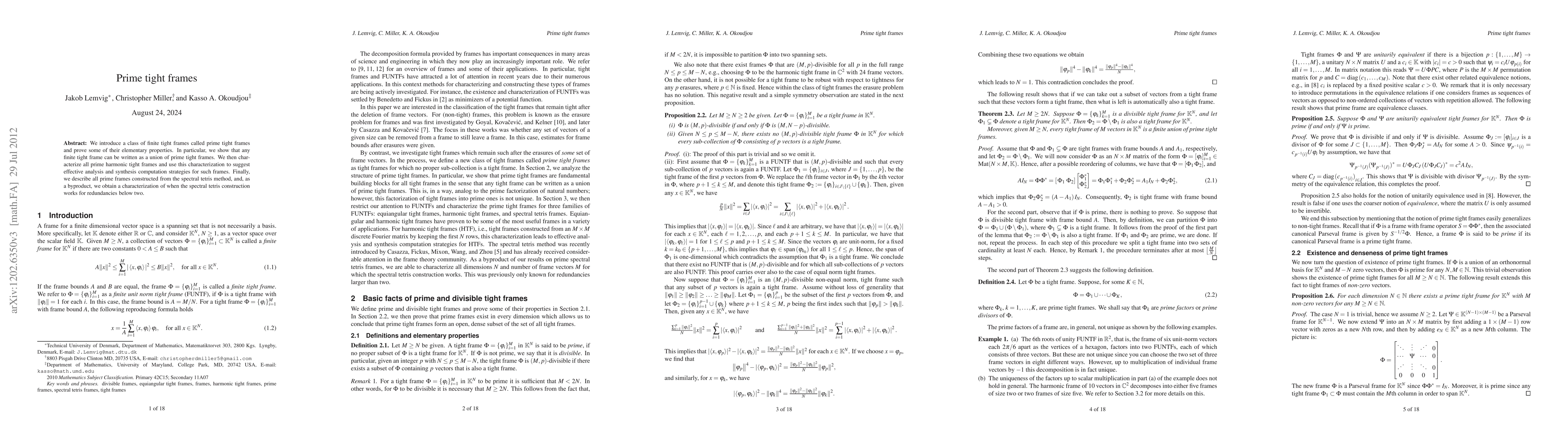 This paper introduces prime tight frames, proving that any finite tight frame can be decomposed into such prime frames. It characterizes prime harmonic tight frames and proposes computational strategies for their analysis and synthesis, while also detailing prime frames from the spectral tetris method and identifying conditions for its success with redundancies below two.