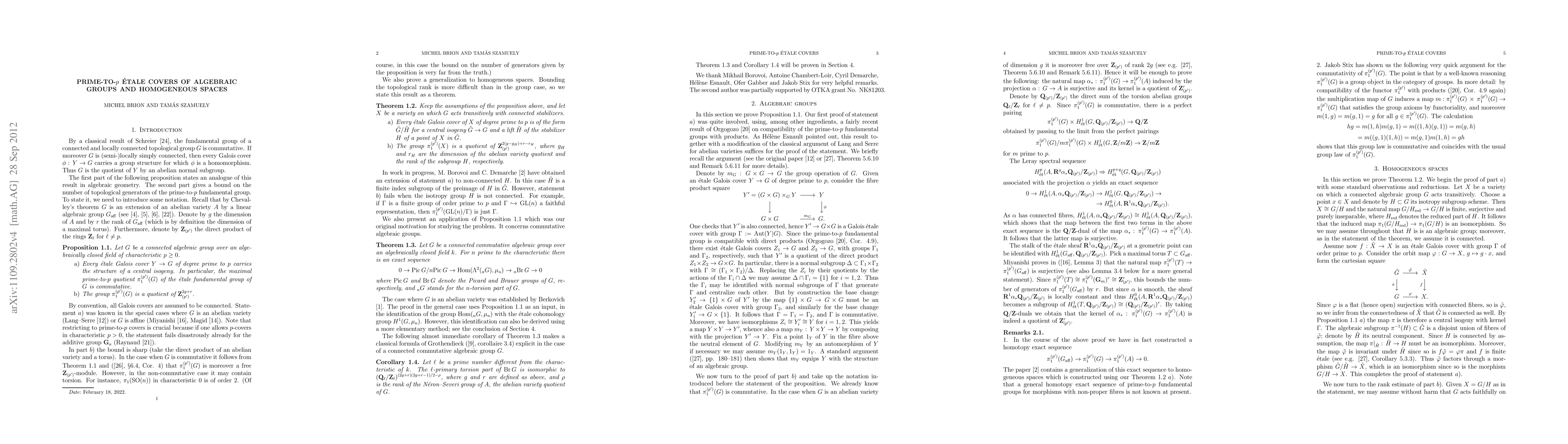 Let G be a connected algebraic group over an algebraically closed field of characteristic p (possibly 0), and X a variety on which G acts transitively with connected stabilizers. We show that any \'etale Galois cover of X of degree prime to p is also homogeneous, and that the maximal prime-to-p quotient of the \'etale fundamental group of X is commutative. We moreover obtain an explicit bound for the number of topological generators of the said quotient. When G is commutative, we also obtain a description of the prime-to-p torsion in the Brauer group of G.