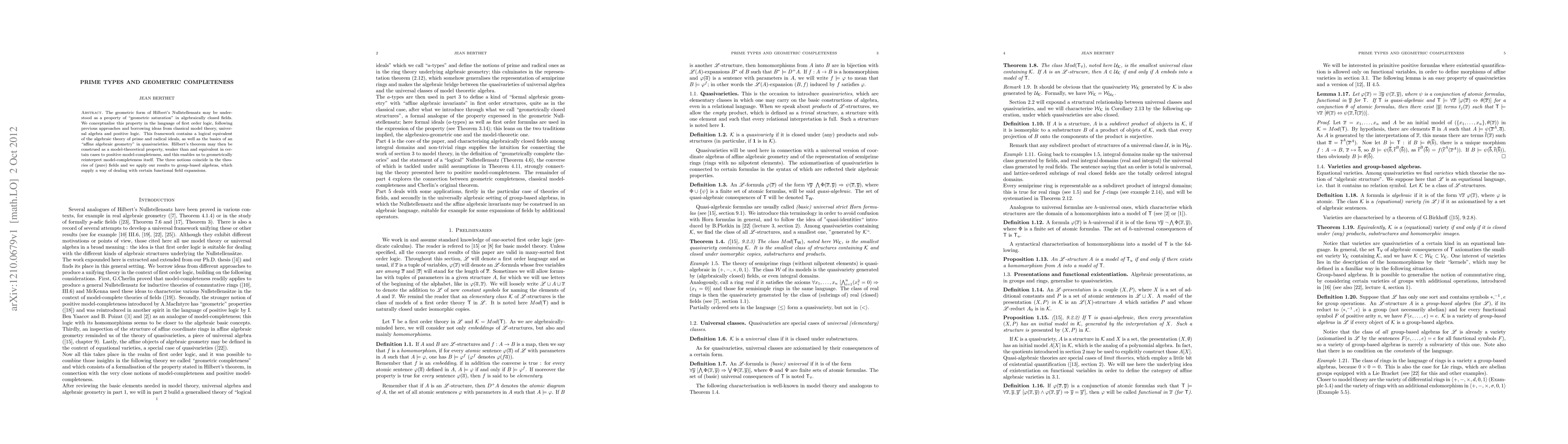 The geometric form of Hilbert's Nullstellensatz may be understood as a property of "geometric saturation" in algebraically closed fields. We conceptualise this property in the language of first order logic, following previous approaches and borrowing ideas from classical model theory, universal algebra and positive logic. This framework contains a logical equivalent of the algebraic theory of prime and radical ideals, as well as the basics of an "affine algebraic geometry" in quasivarieties. Hilbert's theorem may then be construed as a model-theoretical property, weaker than and equivalent in certain cases to positive model-completeness, and this enables us to geometrically reinterpret model-completeness itself. The three notions coincide in the theories of (pure) fields and we apply our results to group-based algebras, which supply a way of dealing with certain functional field expansions.