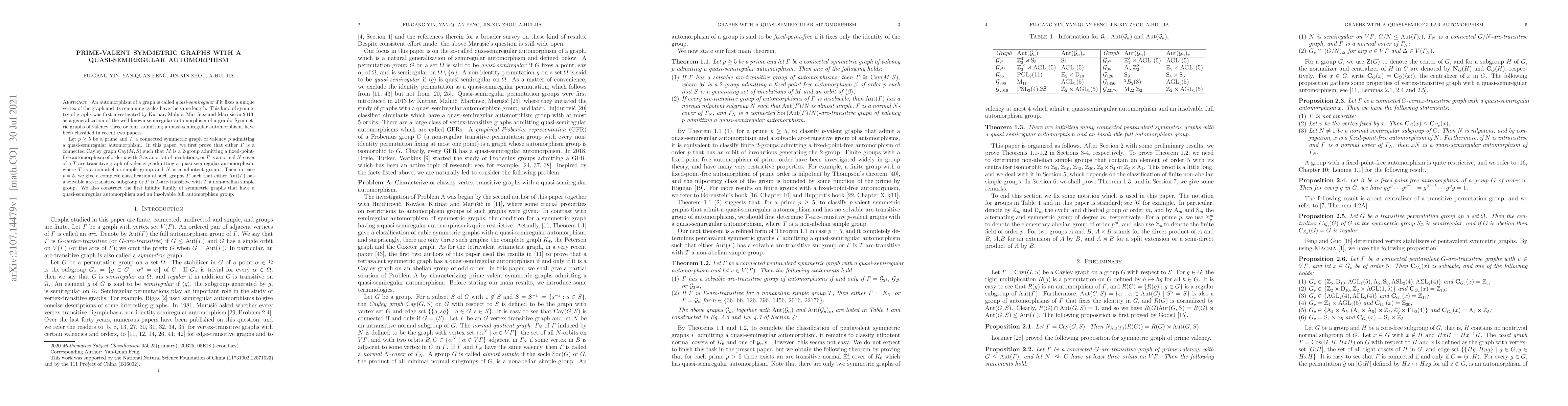 This paper classifies connected symmetric graphs of prime valency $p \geq 5$ with quasi-semiregular automorphisms, proving they are either Cayley graphs with specific properties or $T$-arc-transitive normal covers, and provides a complete classification for $p=5$. It also constructs the first infinite family of such graphs with insolvable full automorphism groups.