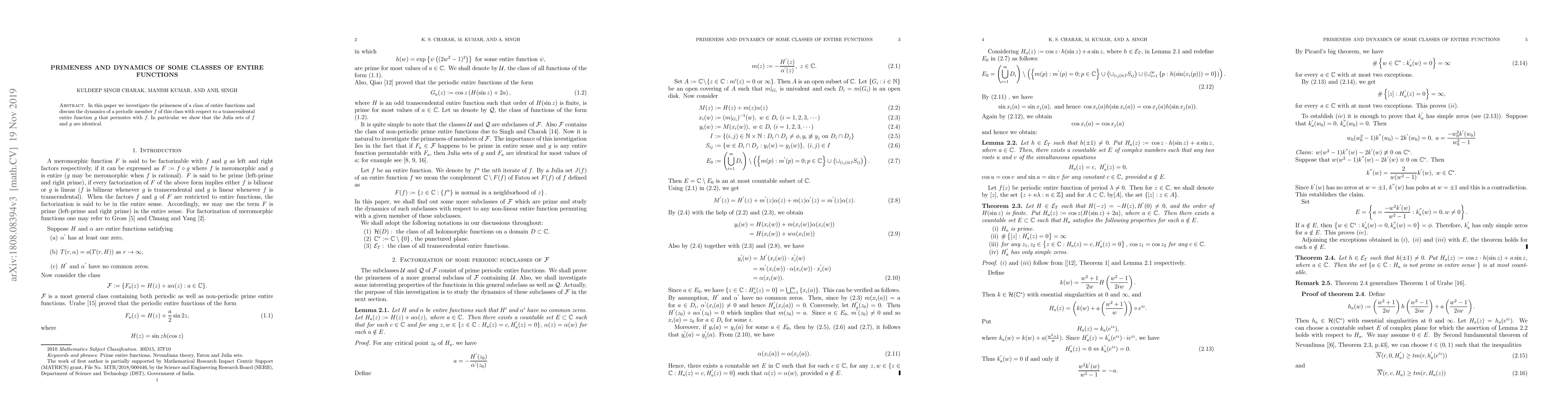 Researchers investigate the primeness of a class of entire functions and show that periodic members have identical Julia sets under permutation with another transcendental function.