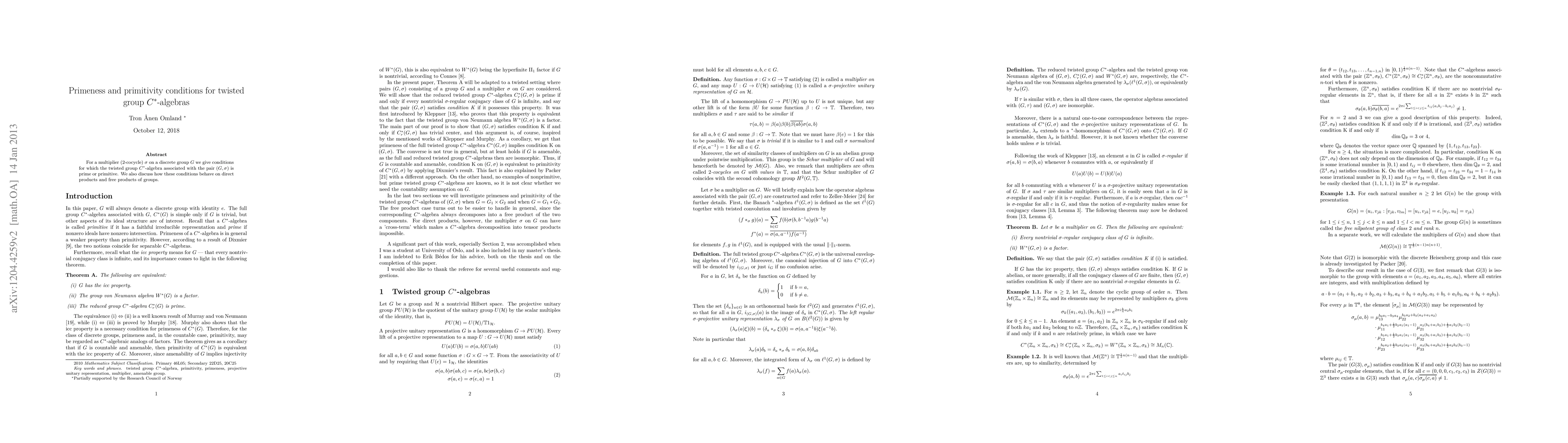 For a multiplier (2-cocycle) $\sigma$ on a discrete group $G$ we give conditions for which the twisted group $C^*$-algebra associated with the pair $(G,\sigma)$ is prime or primitive. We also discuss how these conditions behave on direct products and free products of groups.