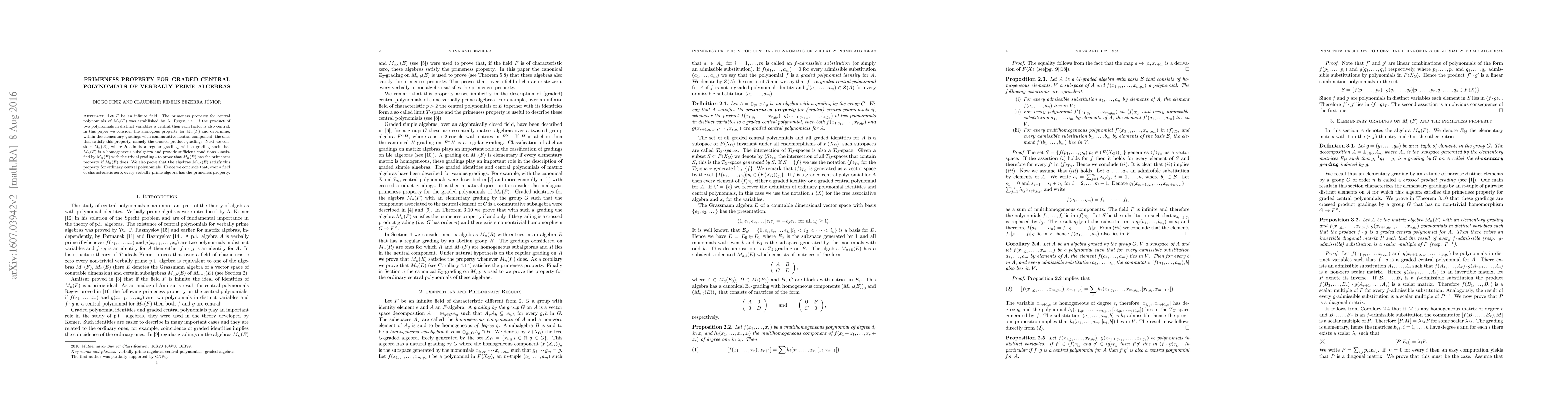 Let $F$ be an infinite field. The primeness property for central polynomials of $M_n(F)$ was proved by A. Regev, i.e., if the product of two polynomials in distinct variables is central then each factor is also central. In this paper we consider the analogous property for $M_n(F)$ and determine, within the elementary gradings with commutative neutral component, the ones that satisfy this property, namely the crossed product gradings. Next we consider $M_n(R)$, where $R$ admits a regular grading, with a grading such that $M_n(F)$ is a homogeneous subalgebra and provide sufficient conditions - satisfied by $M_n(E)$ with the trivial grading - to prove that $M_n(R)$ has the primeness property if $M_n(F)$ does. We also prove that the algebras $M_{a,b}(E)$ satisfy this property for ordinary central polynomials. Hence over a field of characteristic zero every verbally prime algebra as the primeness property.