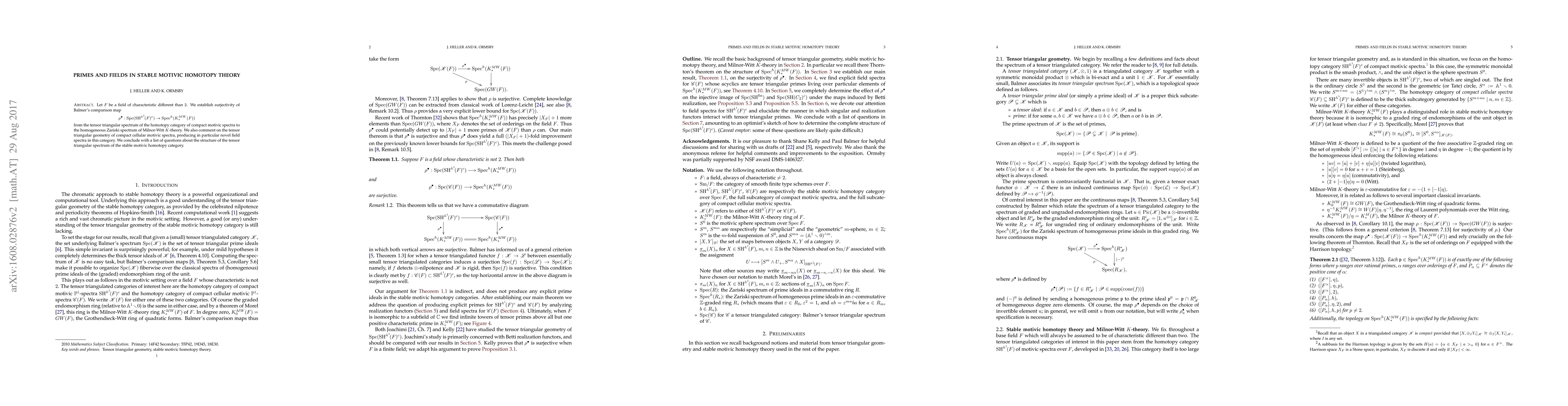 This paper establishes the surjectivity of Balmer's comparison map in stable motivic homotopy theory for fields of characteristic not 2, and discusses novel field spectra arising from tensor triangular geometry. It concludes with open questions regarding the structure of the stable motivic homotopy category.