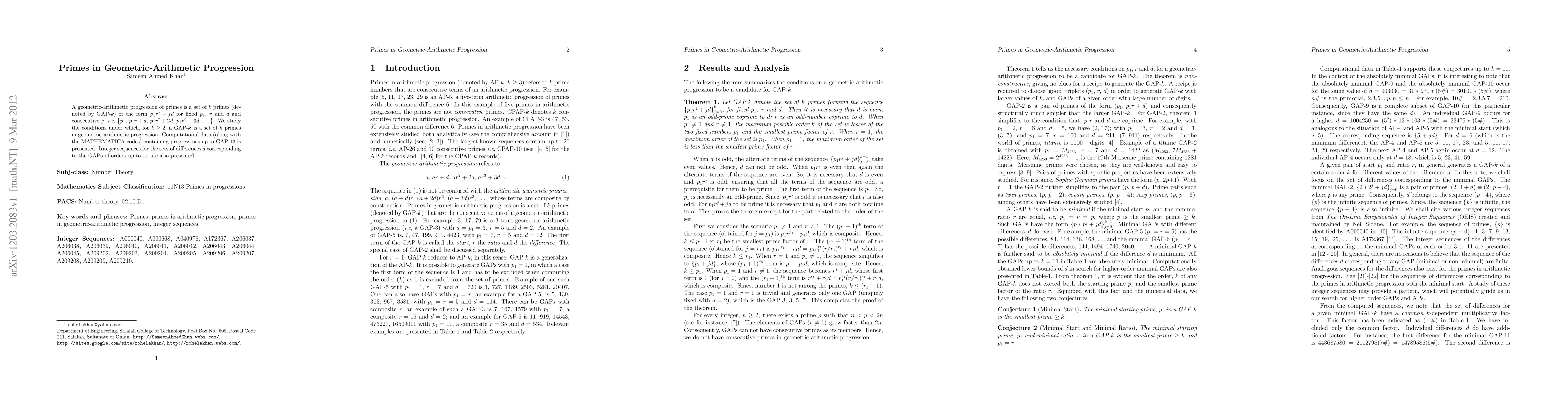 This paper investigates the conditions under which a geometric-arithmetic progression (GAP) of primes, a sequence of $k$ primes of the form $p_1 r^j + j d$, exists for $k \ge 2$. It presents computational data and Mathematica codes for GAPs up to GAP-13, along with integer sequences for the differences $d$ corresponding to GAPs up to order 11.