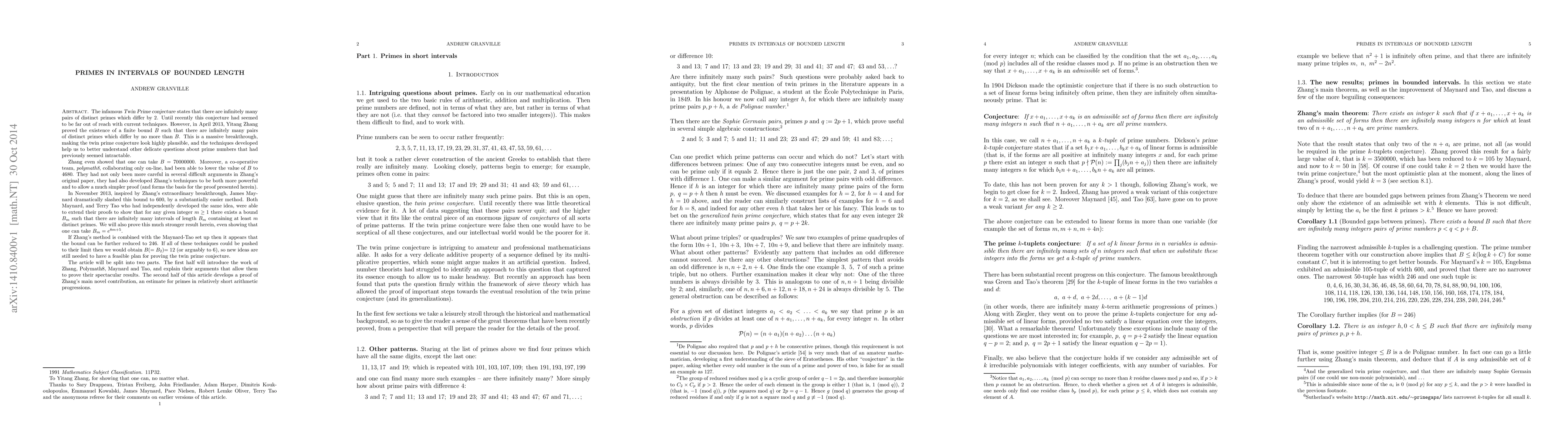 The Twin Prime conjecture states that there are infinitely many pairs of distinct primes which differ by $2$. Until recently this conjecture had seemed to be far out of reach with current techniques. However, in April 2013, Yitang Zhang proved the existence of a finite bound $B$ such that there are infinitely many pairs of distinct primes which differ by no more than $B$. This is a massive breakthrough, making the twin prime conjecture look highly plausible, and the techniques developed help us to better understand other delicate questions about prime numbers that had previously seemed intractable. Zhang even showed that one can take $B = 70000000$. Moreover, a co-operative team, \emph{polymath8}, collaborating only on-line, had been able to lower the value of $B$ to ${4680}$. They had not only been more careful in several difficult arguments in Zhang's original paper, they had also developed Zhang's techniques to be both more powerful and to allow a much simpler proof (and forms the basis for the proof presented herein). In November 2013, inspired by Zhang's extraordinary breakthrough, James Maynard dramatically slashed this bound to $600$, by a substantially easier method. Both Maynard, and Terry Tao who had independently developed the same idea, were able to extend their proofs to show that for any given integer $m\geq 1$ there exists a bound $B_m$ such that there are infinitely many intervals of length $B_m$ containing at least $m$ distinct primes. We will also prove this much stronger result herein, even showing that one can take $B_m=e^{8m+5}$.