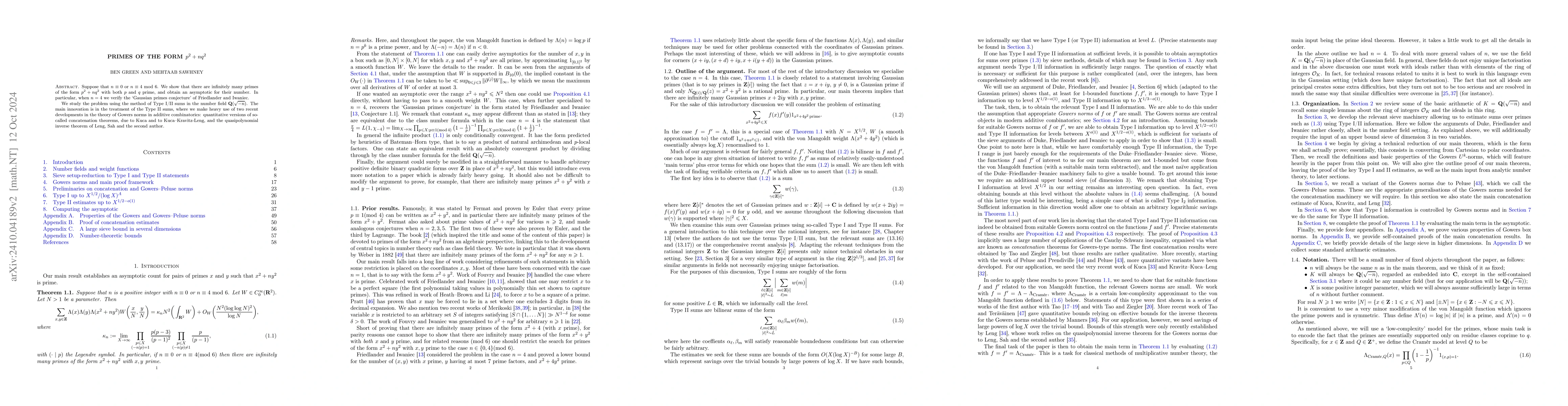 Suppose that $n$ is $0$ or $4$ modulo $6$. We show that there are infinitely many primes of the form $p^2 + nq^2$ with both $p$ and $q$ prime, and obtain an asymptotic for their number. In particular, when $n = 4$ we verify the `Gaussian primes conjecture' of Friedlander and Iwaniec. We study the problem using the method of Type I/II sums in the number field $\mathbf{Q}(\sqrt{-n})$. The main innovation is in the treatment of the Type II sums, where we make heavy use of two recent developments in the theory of Gowers norms in additive combinatorics: quantitative versions of so-called concatenation theorems, due to Kuca and to Kuca--Kravitz-Leng, and the quasipolynomial inverse theorem of Leng, Sah and the second author.