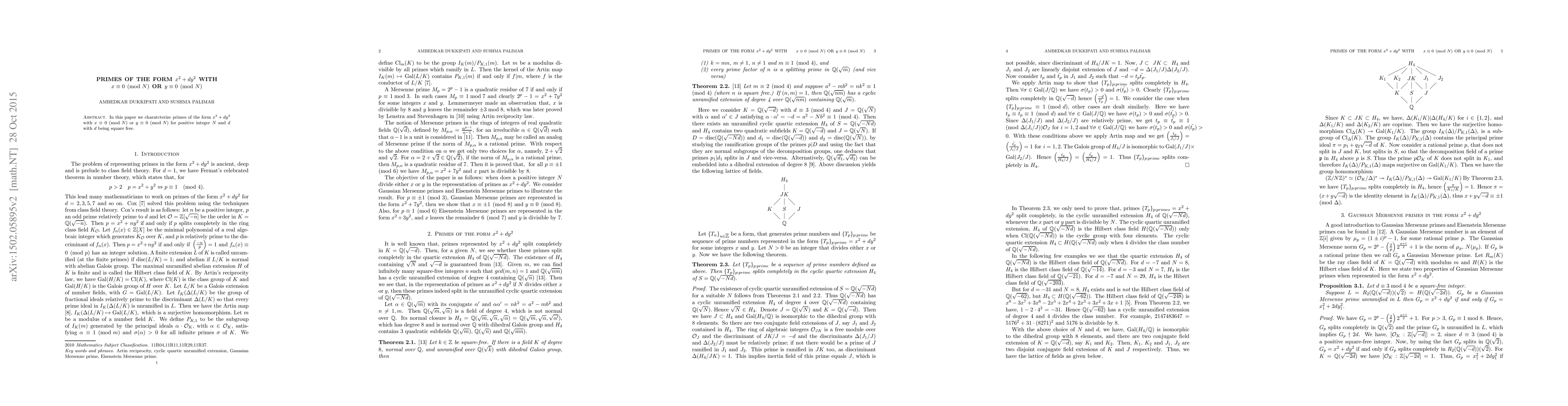 This paper characterizes primes of the form $x^2+dy^2$ where either $x$ is divisible by a positive integer $N$ or $y$ is divisible by $N$, under the condition that $d$ is a square-free positive integer. The study focuses on the distribution and properties of such primes.