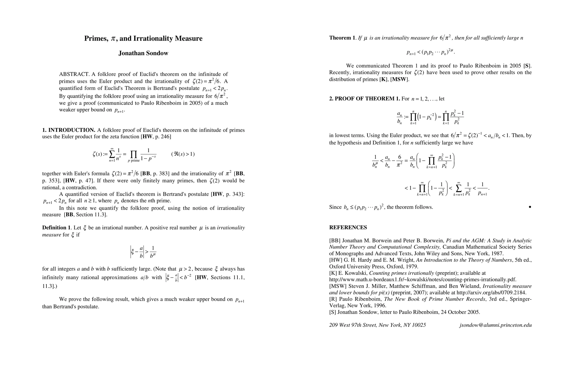 A folklore proof of Euclid's theorem on the infinitude of primes uses the Euler product and the irrationality of $\zeta(2) = \pi^2/6$. A quantified form of Euclid's Theorem is Bertrand's postulate $p_{n+1} < 2p_n$. By quantifying the folklore proof using an irrationality measure for $6/\pi^2$, we give a proof (communicated to Paulo Ribenboim in 2005) of a much weaker upper bound on $p_{n+1}$.