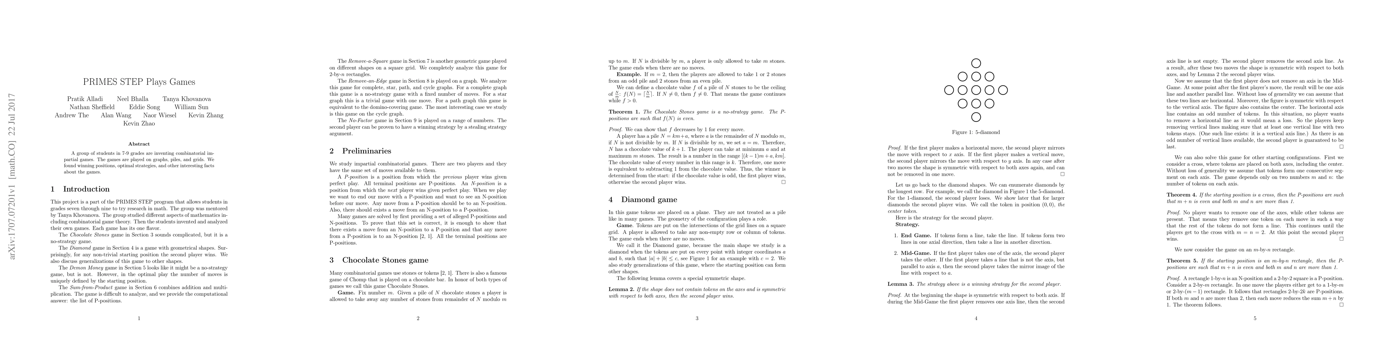 A group of students in 7-9 grades are inventing combinatorial impartial games. The games are played on graphs, piles, and grids. We found winning positions, optimal strategies, and other interesting facts about the games.