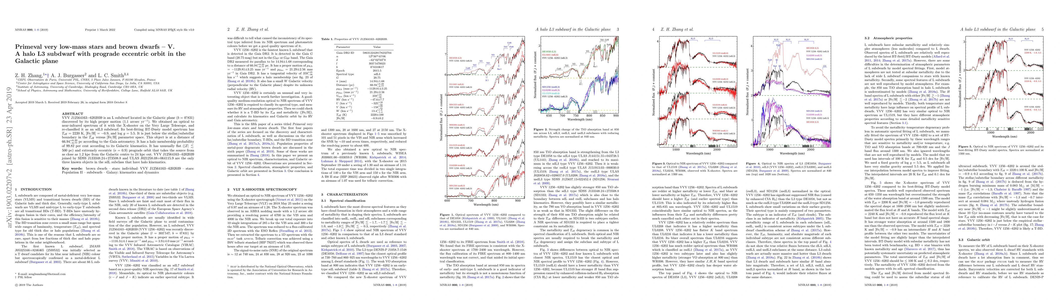 The research identifies VVV J12564163−6202039, an L subdwarf in the Galactic plane with high proper motion, as a halo member with a unique, extremely eccentric prograde orbit. Its BT-Dusty model spectrum indicates T_eff = 2220 K, [Fe/H] = -0.9, and log g = 5.5, placing it near the stellar/substellar boundary. It's one of only three known halo sdL objects alongside SDSS J133348.24+273508.8 and ULAS J021258.08+064115.9.
