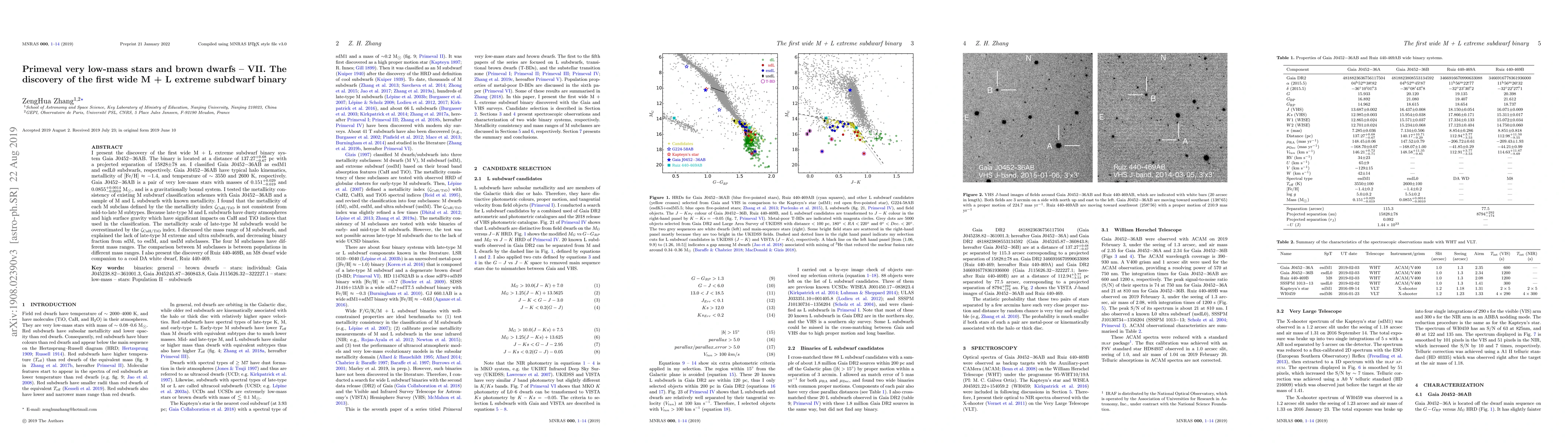 I present the discovery of the first wide M + L extreme subdwarf binary system Gaia J0452$-$36AB. The binary is located at a distance of 137.27$^{+0.68}_{-0.67}$ pc with a projected separation of 15828$\pm$78 au. I classified Gaia J0452$-$36AB as esdM1 and esdL0 subdwarfs, respectively. Gaia J0452$-$36AB have typical halo kinematics, metallicity of [Fe/H] $\approx -1.4$, and temperature of $\sim$ 3550 and 2600 K, respectively. Gaia J0452$-$36AB is a pair of very low-mass stars with masses of 0.151$^{+0.029}_{-0.019}$ and 0.0855$^{+0.0014}_{-0.0010}$ M$_{\odot}$, and is a gravitationally bound system. I tested the metallicity consistency of existing M subdwarf classification schemes with Gaia J0452$-$36AB and a sample of M and L subdwarfs with known metallicity. I found that the metallicity of each M subclass defined by the the metallicity index $\zeta_{\rm CaH/TiO}$ is not consistent from mid to late M subtypes. Because late-type M and L subdwarfs have dusty atmospheres and high surface gravity which have significant impacts on CaH and TiO indices that used in the classification. The metallicity scale of late-type M subdwarfs would be overestimated by the $\zeta_{\rm CaH/TiO}$ index. I discussed the mass range of M subdwarfs, and explained the lack of late-type M extreme and ultra subdwarfs, and decreasing binary fraction from sdM, to esdM, and usdM subclasses. The four M subclasses have different mass ranges. The comparison between M subclasses is between populations in different mass ranges. I also present the discovery of Ruiz 440-469B, an M8 dwarf wide companion to a cool DA white dwarf, Ruiz 440-469.