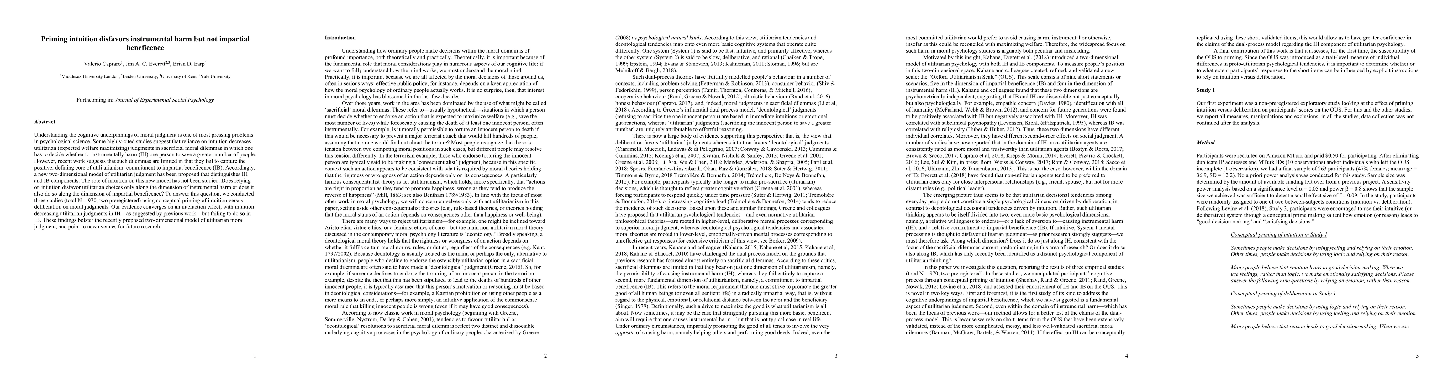 Understanding the cognitive underpinnings of moral judgment is one of most pressing problems in psychological science. Some highly-cited studies suggest that reliance on intuition decreases utilitarian (expected welfare maximizing) judgments in sacrificial moral dilemmas in which one has to decide whether to instrumentally harm (IH) one person to save a greater number of people. However, recent work suggests that such dilemmas are limited in that they fail to capture the positive, defining core of utilitarianism: commitment to impartial beneficence (IB). Accordingly, a new two-dimensional model of utilitarian judgment has been proposed that distinguishes IH and IB components. The role of intuition on this new model has not been studied. Does relying on intuition disfavor utilitarian choices only along the dimension of instrumental harm or does it also do so along the dimension of impartial beneficence? To answer this question, we conducted three studies (total N = 970, two preregistered) using conceptual priming of intuition versus deliberation on moral judgments. Our evidence converges on an interaction effect, with intuition decreasing utilitarian judgments in IH - as suggested by previous work - but failing to do so in IB. These findings bolster the recently proposed two-dimensional model of utilitarian moral judgment, and point to new avenues for future research.