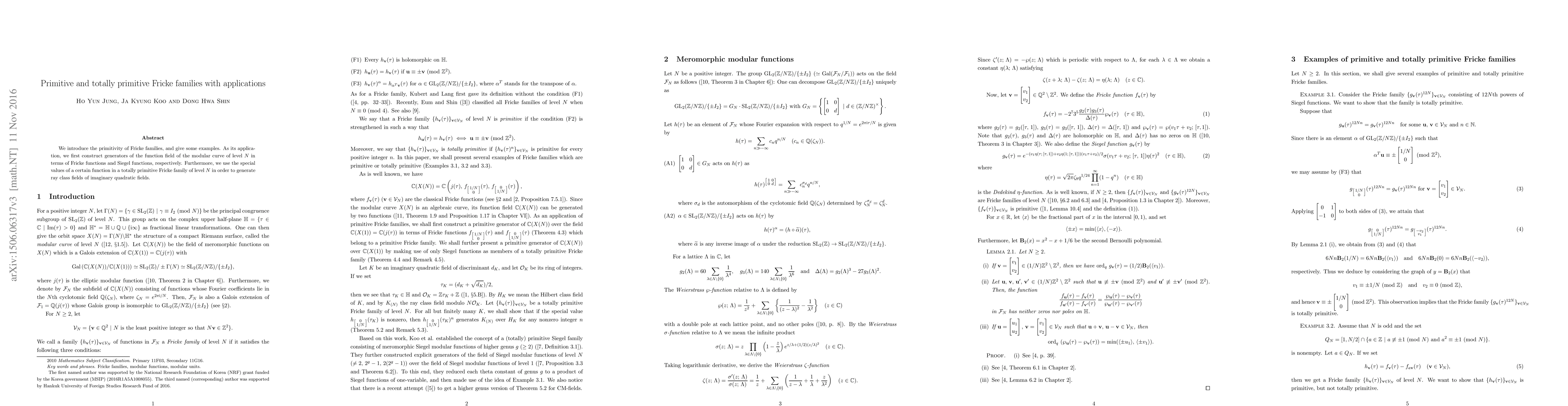 This paper introduces the concept of primitivity in Fricke families and provides examples. It constructs generators for the function field of modular curves of level $N$ using Fricke and Siegel functions, and uses special values of totally primitive Fricke functions to generate ray class fields for imaginary quadratic fields.