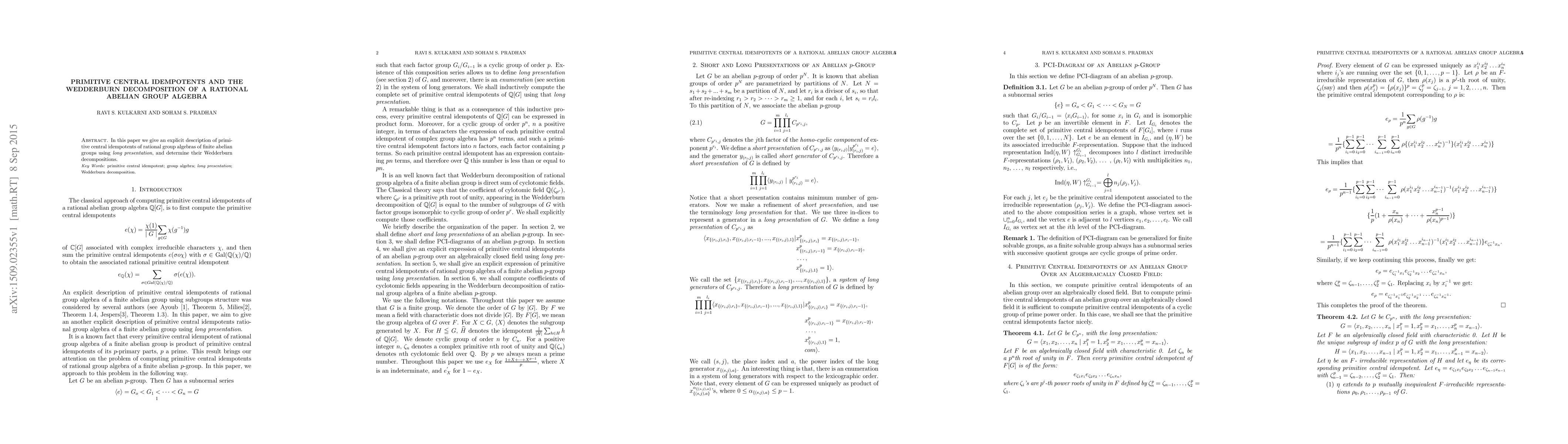 Summary: This paper provides an explicit description of primitive central idempotents in rational group algebras of finite abelian groups, utilizing long presentations, and determines their corresponding Wedderburn decompositions.
