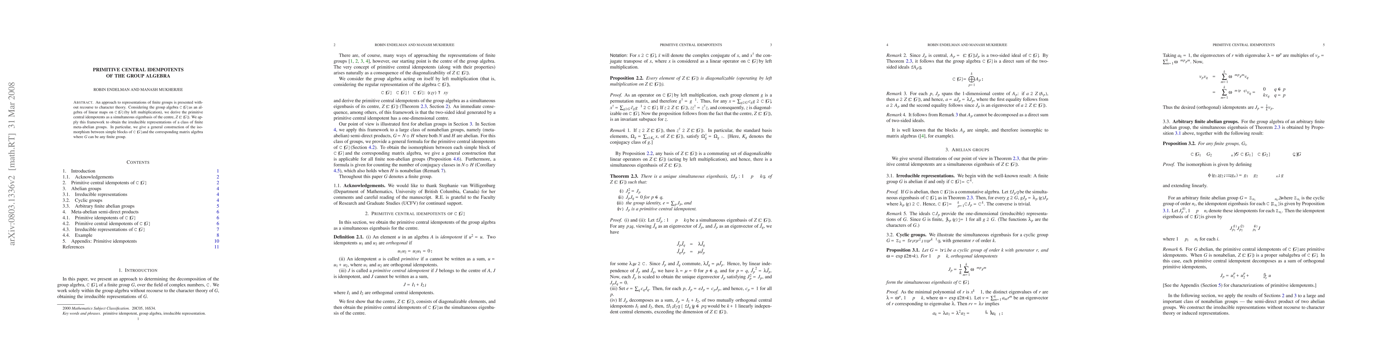 An approach to representations of finite groups is presented without recourse to character theory. Considering the group algebra C[G] as an algebra of linear maps on C[G] (by left multiplication), we derive the primitive central idempotents as a simultaneous eigenbasis of the centre, Z(C[G]). We apply this framework to obtain the irreducible representations of a class of finite meta-abelian groups. In particular, we give a general construction of the isomorphism between simple blocks of C[G] and the corresponding matrix algebra where G can be any finite group.