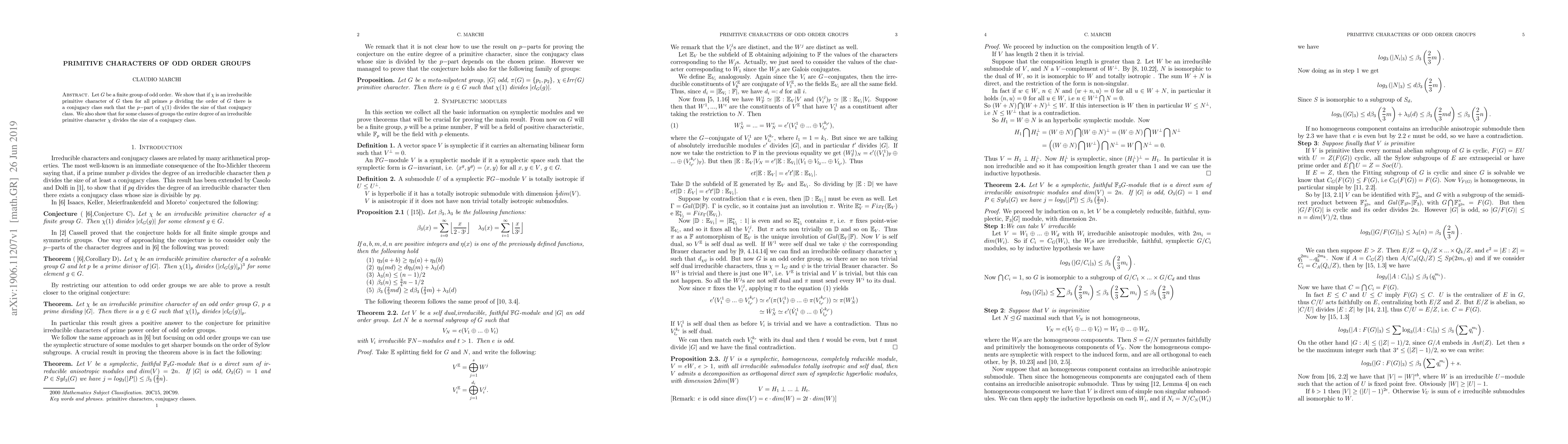 This paper demonstrates that for finite groups of odd order, irreducible primitive characters have values whose $p$-parts divide the sizes of specific conjugacy classes for each prime $p$ dividing the group's order. Additionally, it proves that for certain groups, the entire degree of such characters divides the size of a particular conjugacy class.