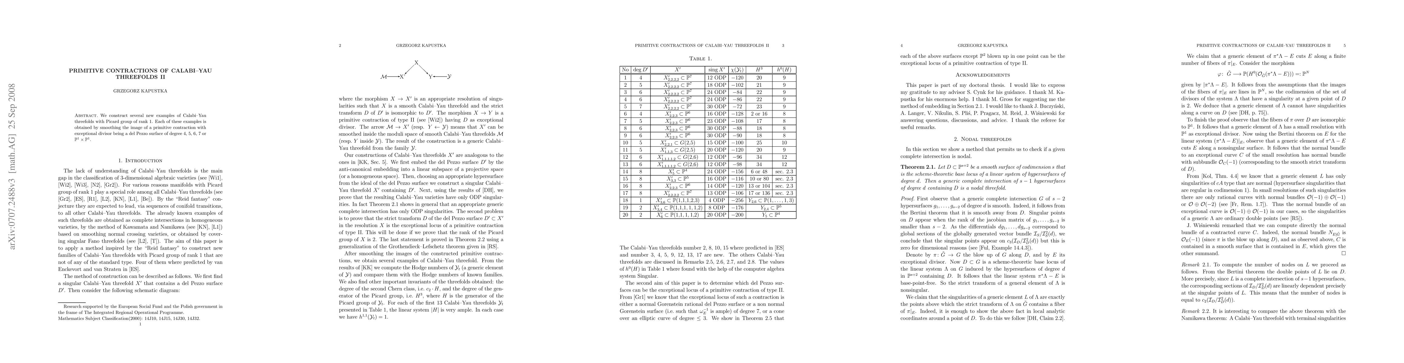 We construct 16 new examples of Calabi--Yau threefolds with Picard group of rank 1. Each of these examples is obtained by smoothing the image of a primitive contraction with exceptional divisor being a del Pezzo surface of degree 6, 7 or $\mathbb{P}^1\times \mathbb{P}^1$.