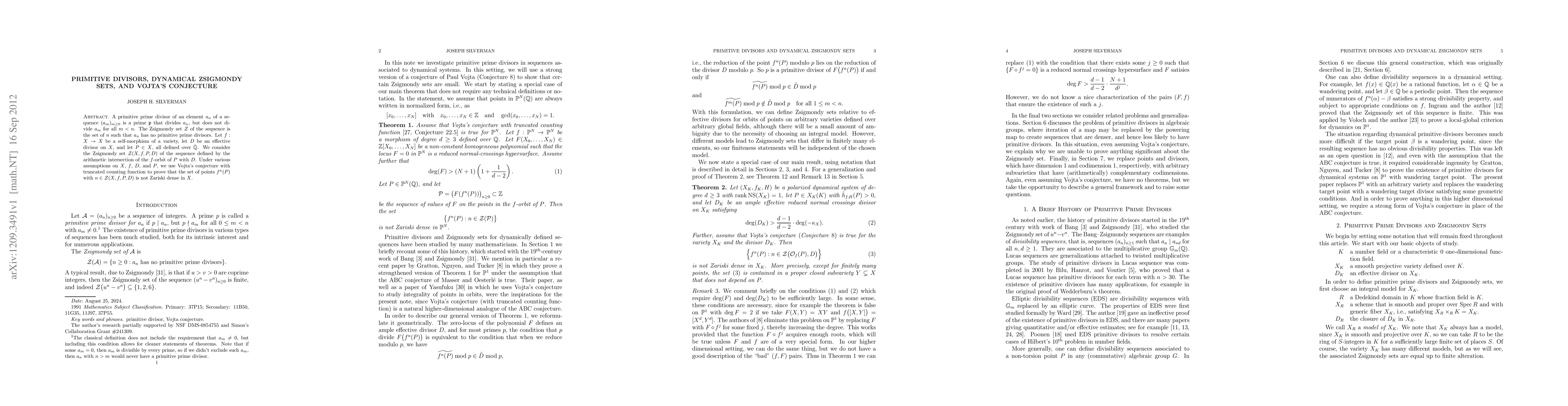 A primitive prime divisor of an element a_n of a sequence (a_1,a_2,a_3,...) is a prime P that divides a_n, but does not divide a_m for all m < n. The Zsigmondy set Z of the sequence is the set of n such that a_n has no primitive prime divisors. Let f : X --> X be a self-morphism of a variety, let D be an effective divisor on X, and let P be a point of X, all defined over the algebraic closure of Q. We consider the Zsigmondy set Z(X,f,P,D) of the sequence defined by the arithmetic intersection of the f-orbit of P with D. Under various assumptions on X, f, D, and P, we use Vojta's conjecture with truncated counting function to prove that the set of points f^n(P) with n in Z(X,f,P,D) is not Zariski dense in X.