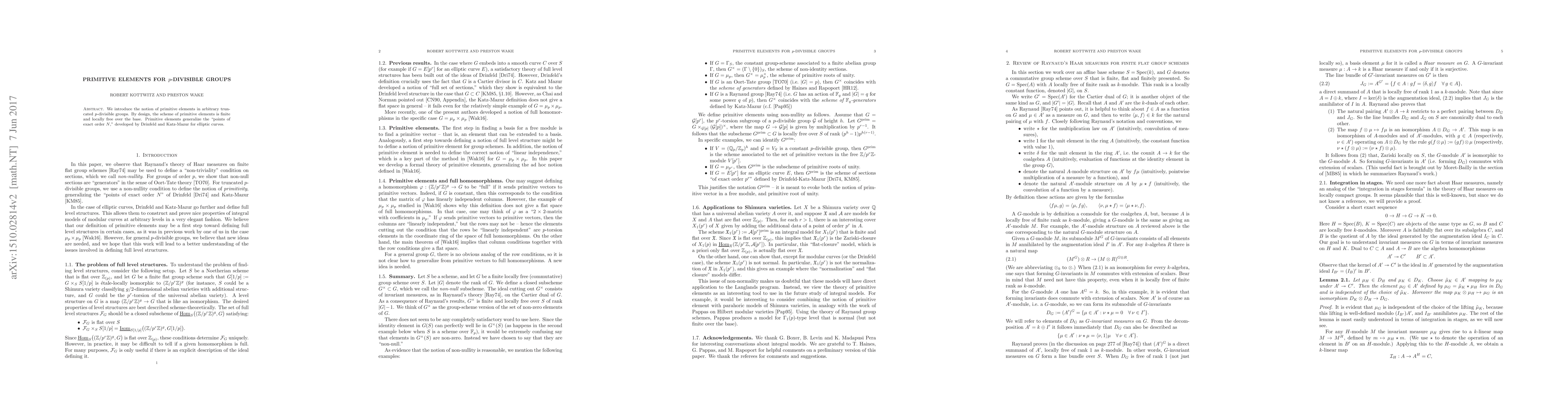 Summary: This paper introduces the concept of primitive elements in truncated $p$-divisible groups, showing that the scheme of primitive elements is finite and locally free over the base, and extends the notion of "points of exact order $N$" previously developed by Drinfeld and Katz-Mazur for elliptic curves.