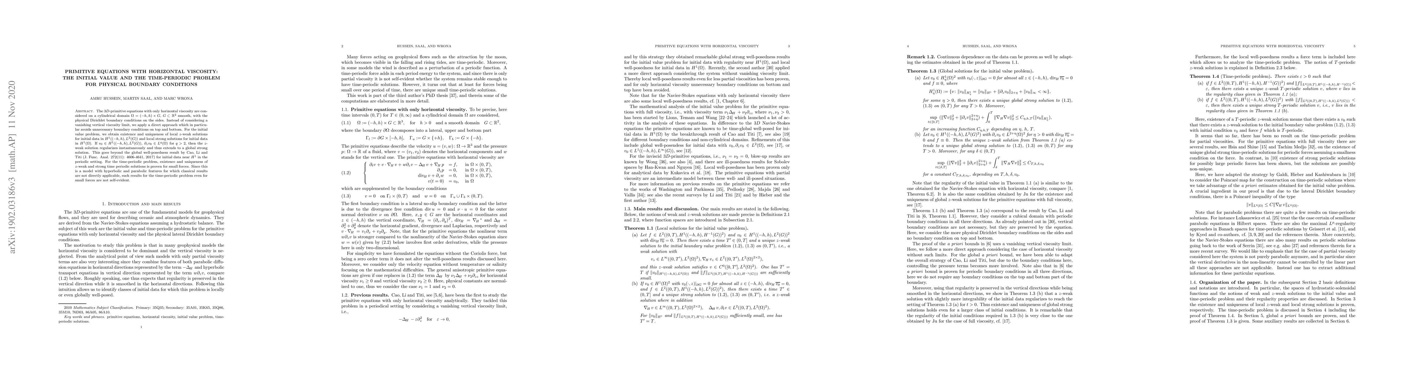 This paper studies the 3D primitive equations with horizontal viscosity on a cylindrical domain under physical Dirichlet boundary conditions, avoiding vertical viscosity limits. It proves existence and uniqueness of local $z$-weak and strong solutions for the initial value problem, and extends these solutions globally under certain conditions. For the time-periodic problem, the paper establishes existence and uniqueness of time-periodic solutions for small forces.