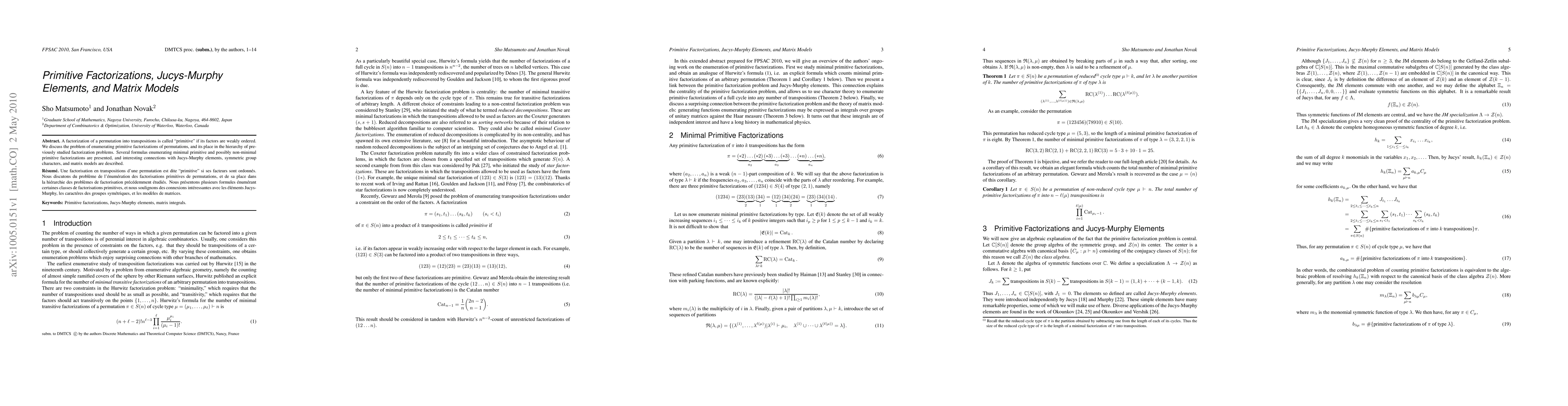 This paper explores the enumeration of primitive factorizations of permutations, defined as factorizations into transpositions that are weakly ordered. It presents formulas for minimal and non-minimal primitive factorizations and connects these with Jucys-Murphy elements, symmetric group characters, and matrix models.