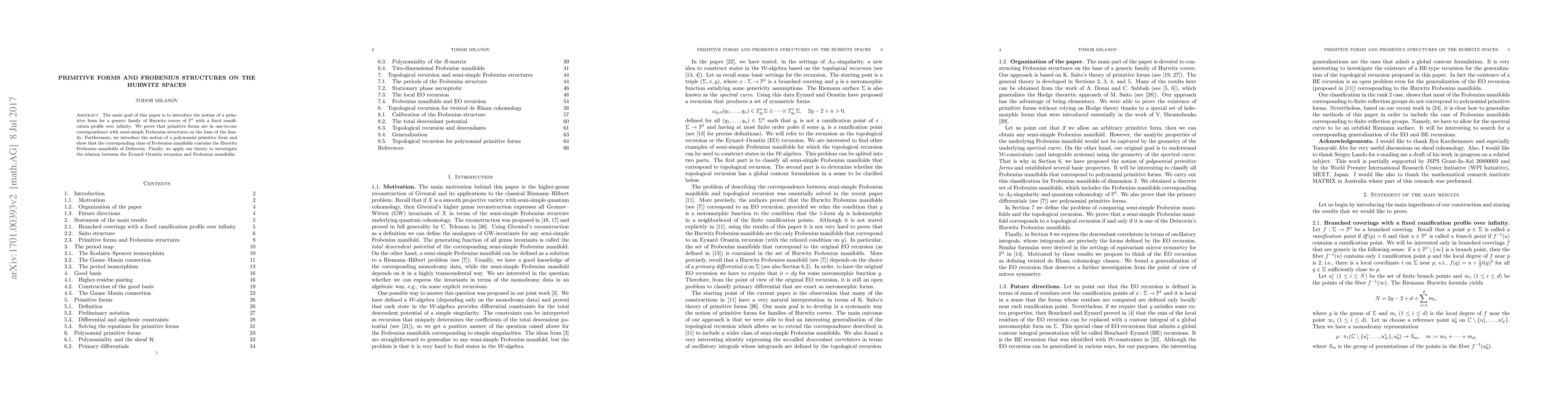 The main goal of this paper is to introduce the notion of a primitive form for a generic family of Hurwitz covers of $\mathbb{P}^1$ with a fixed ramification profile over infinity. We prove that primitive forms are in one-to-one correspondence with semi-simple Frobenius structures on the base of the family. Furthermore, we introduce the notion of a polynomial primitive form and show that the corresponding class of Frobenius manifolds contains the Hurwitz Frobenius manifolds of Dubrovin. Finally, we apply our theory to investigate the relation between the Eynard--Orantin recursion and Frobenius manifolds.