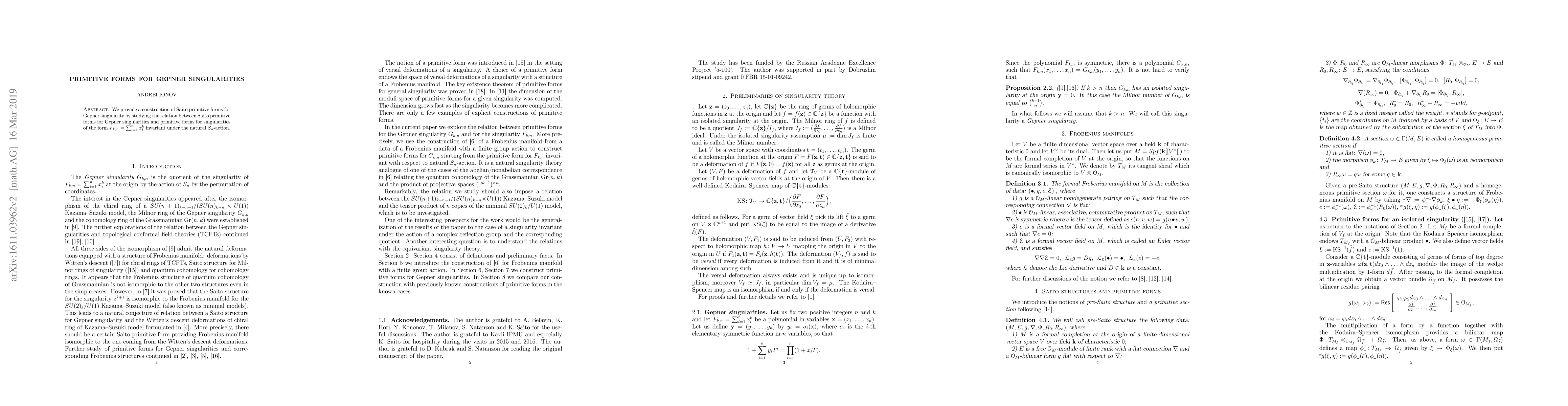 We provide a construction of Saito primitive forms for Gepner singularity by studying the relation between Saito primitive forms for Gepner singularities and primitive forms for singularities of the form $F_{k,n}=\sum_{i=1}^n x_i^k$ invariant under the natural $S_n$-action.