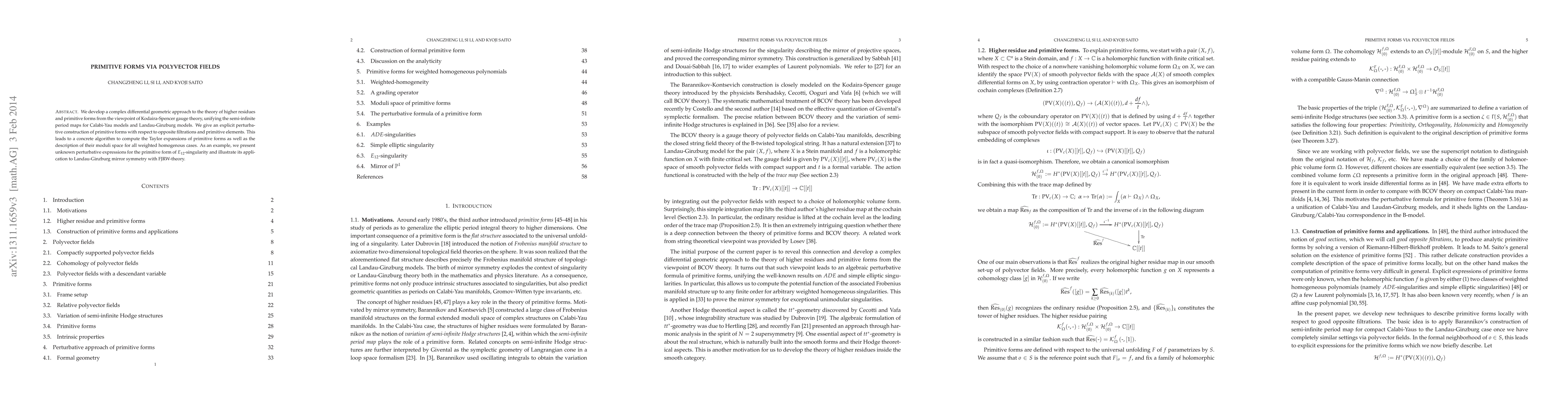 We develop a complex differential geometric approach to the theory of higher residues and primitive forms from the viewpoint of Kodaira-Spencer gauge theory, unifying the semi-infinite period maps for Calabi-Yau models and Landau-Ginzburg models. We give an explicit perturbative construction of primitive forms with respect to opposite filtrations and primitive elements. This leads to a concrete algorithm to compute the Taylor expansions of primitive forms as well as the description of their moduli space for all weighted homogenous cases. As an example, we present unknown perturbative expressions for the primitive form of E_12 singularity and illustrate its application to Landau-Ginzburg mirror symmetry with FJRW-theory.