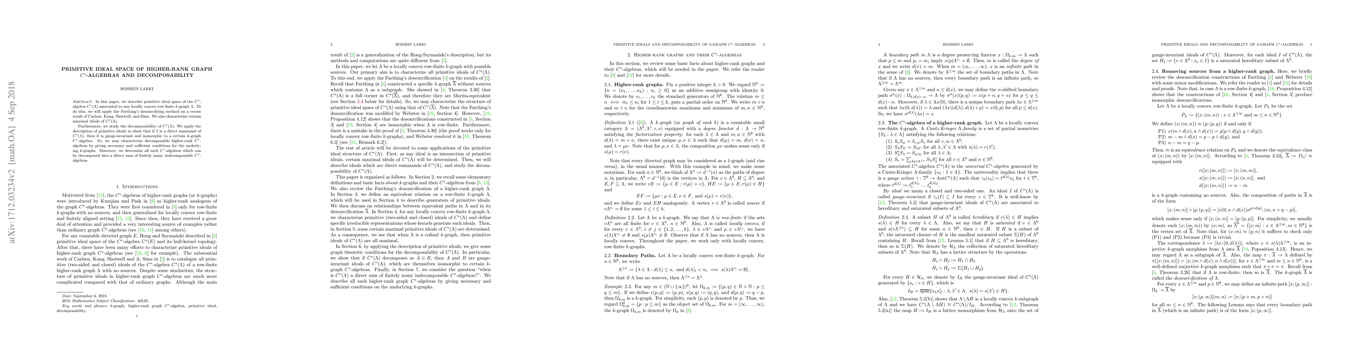 In this paper, we describe primitive ideal space of the $C^*$-algebra $C^*(\Lambda)$ associated to any locally convex row-finite $k$-graph $\Lambda$. To do this, we will apply the Farthing's desourcifying method on a recent result of Carlsen, Kang, Shotwell, and Sims. We also characterize certain maximal ideals of $C^*(\Lambda)$. Furthermore, we study the decomposability of $C^*(\Lambda)$. We apply the description of primitive ideals to show that if $I$ is a direct summand of $C^*(\Lambda)$, then it is gauge-invariant and isomorphic to a certain $k$-graph $C^*$-algebra. So, we may characterize decomposable higher-rank $C^*$-algebras by giving necessary and sufficient conditions for the underlying $k$-graphs. Moreover, we determine all such $C^*$-algebras which can be decomposed into a direct sum of finitely many indecomposable $C^*$-algebras.