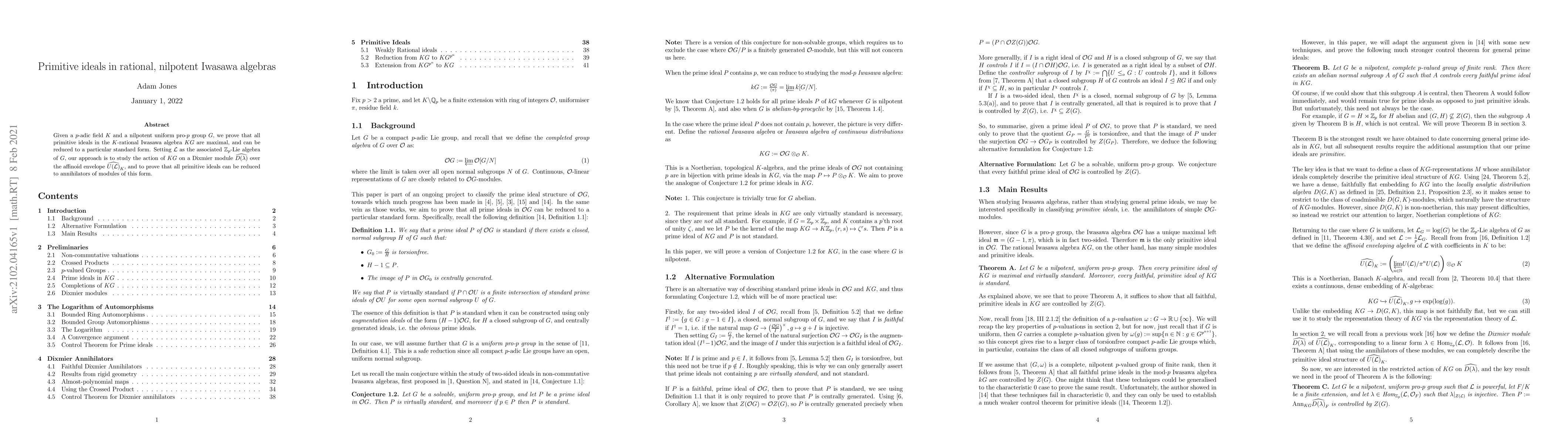 This paper proves that all primitive ideals in the $K$-rational Iwasawa algebra $KG$ of a nilpotent uniform pro-$p$ group $G$ over a $p$-adic field $K$ are maximal and can be expressed in a standard form. The study focuses on the action of $KG$ on Dixmier modules over the affinoid envelope of the associated $\mathbb{Z}_p$-Lie algebra $\mathcal{L}$.