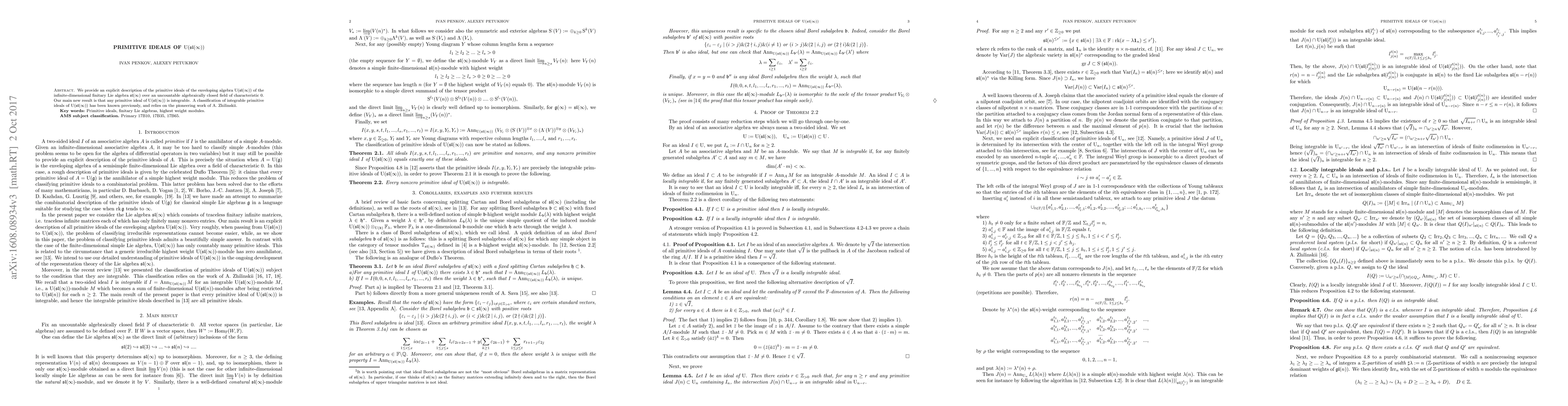 We provide an explicit description of the primitive ideals of the enveloping algebra $\operatorname{U}(\frak{sl}(\infty))$ of the infinite-dimensional finitary Lie algebra $\frak{sl}(\infty)$ over an uncountable algebraically closed field of characteristic 0. Our main new result is that any primitive ideal of $\operatorname{U}(\frak{sl}(\infty))$ is integrable. A classification of integrable primitive ideals of $\operatorname{U}(\frak{sl}(\infty))$ has been known previously, and relies on the pioneering work of A. Zhilinskii.