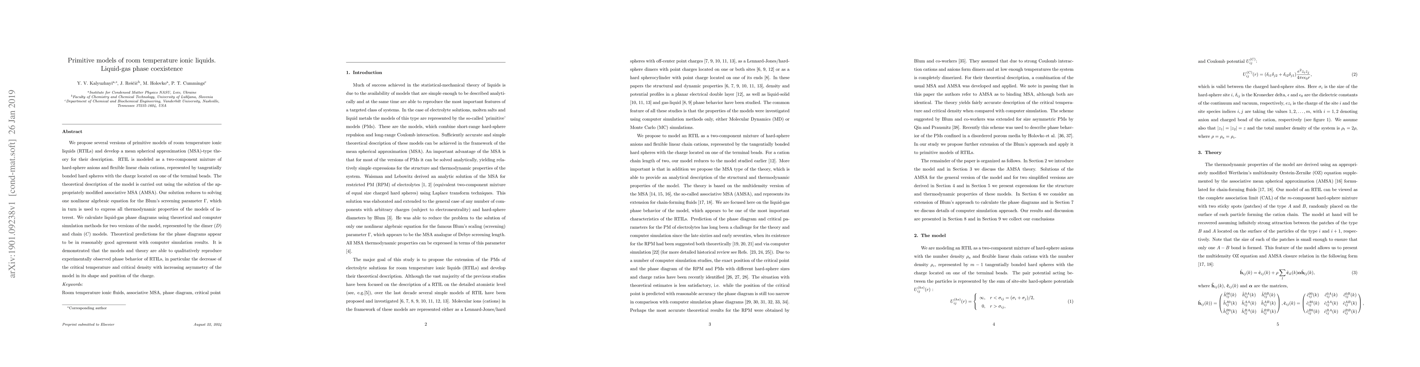 This paper proposes primitive models for room temperature ionic liquids (RTILs) and develops a mean spherical approximation theory to describe their liquid-gas phase coexistence. The models, including dimer and chain versions, show good agreement with simulation results and qualitatively reproduce experimental phase behavior.