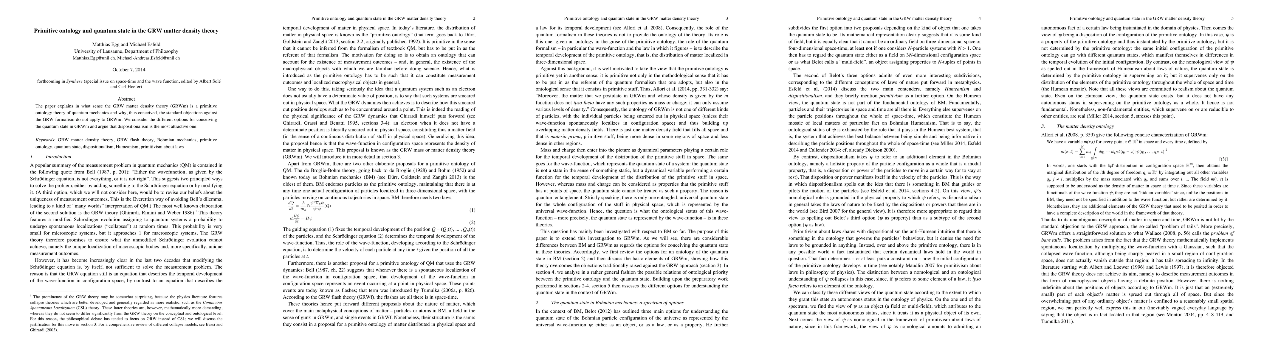 The paper argues that the GRW matter density theory (GRWm) functions as a primitive ontology in quantum mechanics, thereby avoiding standard objections against the GRW formalism. It concludes that dispositionalism provides the most compelling interpretation of the quantum state within GRWm.