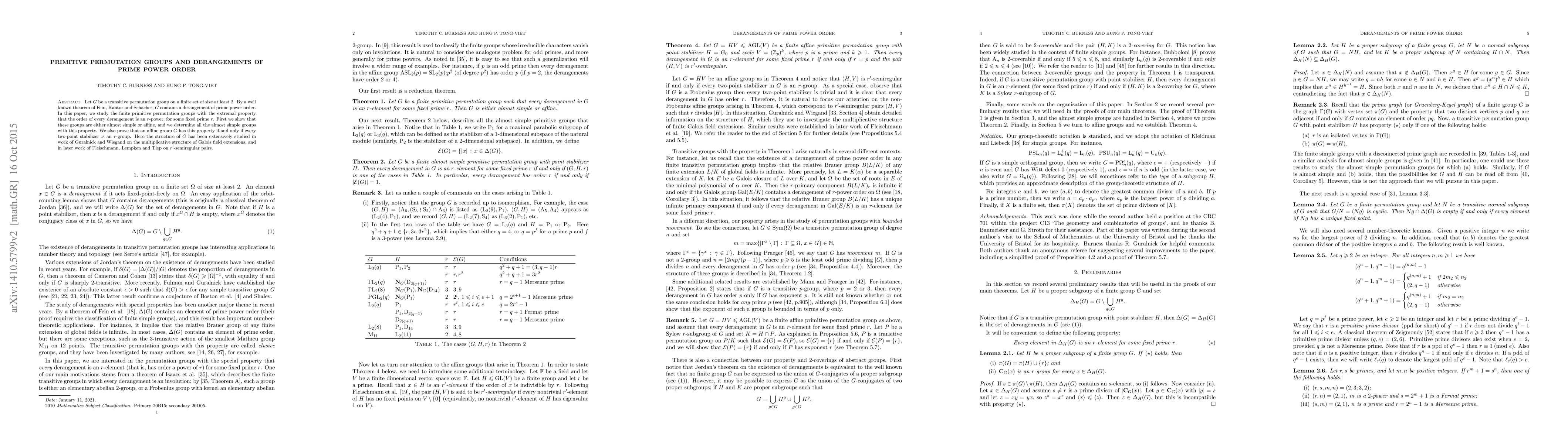 This paper examines finite primitive permutation groups where every derangement has an order that is a power of a fixed prime $r$. It finds that such groups are either almost simple or affine, and it determines the almost simple cases, while also proving that affine groups exhibit this property if each two-point stabilizer is an $r$-group.