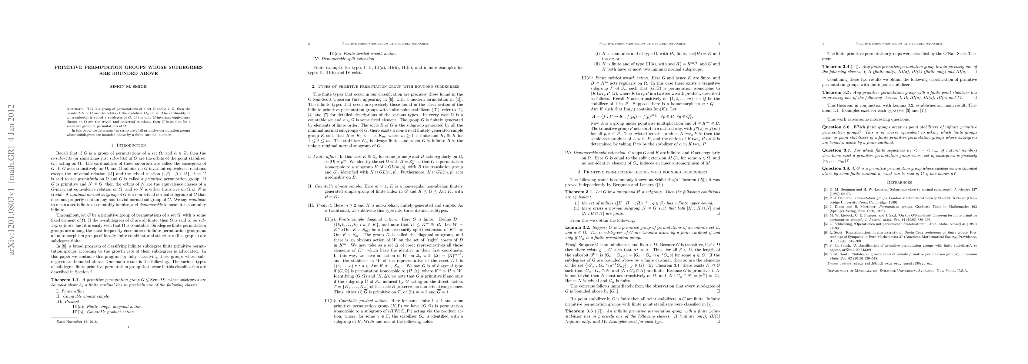 If $G$ is a group of permutations of a set $\Omega$ and $\alpha \in \Omega$, then the {\em $\alpha$-suborbits} of $G$ are the orbits of the stabilizer $G_\alpha$ on $\Omega$. The cardinality of an $\alpha$-suborbit is called a {\em subdegree} of $G$. If the only $G$-invariant equivalence classes on $\Omega$ are the trivial and universal relations, then $G$ is said to be a {\em primitive} group of permutations of $\Omega$. In this paper we determine the structure of all primitive permutation groups whose subdegrees are bounded above by a finite cardinal number.
