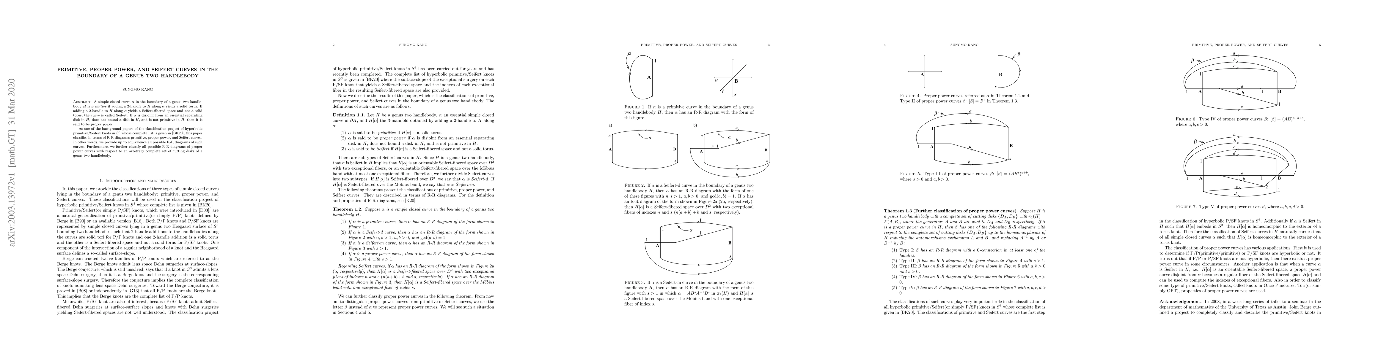 A simple closed curve $\alpha$ in the boundary of a genus two handlebody $H$ is primitive if adding a 2-handle to $H$ along $\alpha$ yields a solid torus. If adding a 2-handle to $H$ along $\alpha$ yields a Seifert-fibered space and not a solid torus, the curve is called Seifert. If $\alpha$ is disjoint from an essential separating disk in $H$, does not bound a disk in $H$, and is not primitive in $H$, then it is said to be proper power. As one of the background papers of the classification project of hyperbolic primitive/Seifert knots in $S^3$ whose complete list is given in [BK20], this paper classifies in terms of R-R diagrams primitive, proper power, and Seifert curves. In other words, we provide up to equivalence all possible R-R diagrams of such curves. Furthermore, we further classify all possible R-R diagrams of proper power curves with respect to an arbitrary complete set of cutting disks of a genus two handlebody.