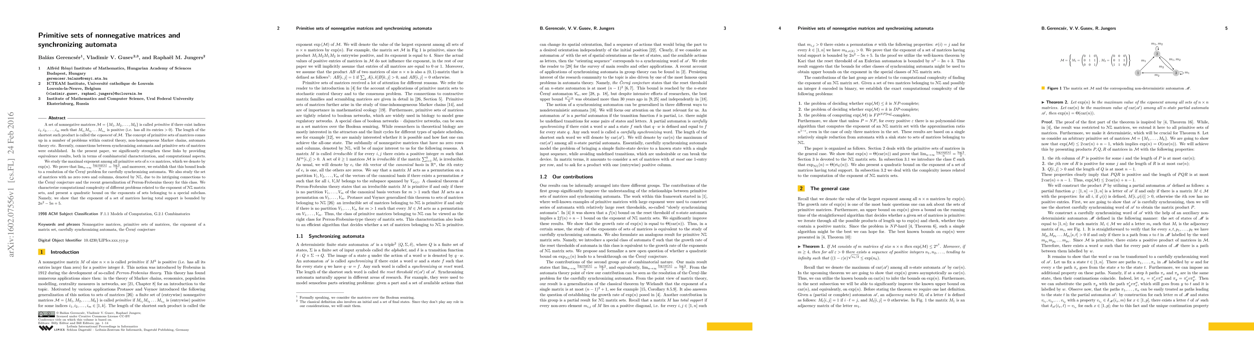 This paper explores primitive sets of nonnegative matrices and their links to synchronizing automata, establishing equivalences in combinatorial and computational aspects. It finds that the maximal exponent among such sets approaches a logarithmic growth rate, resolving the Černý problem for specific automata, and provides a quadratic bound on exponents for a subclass of these matrix sets.