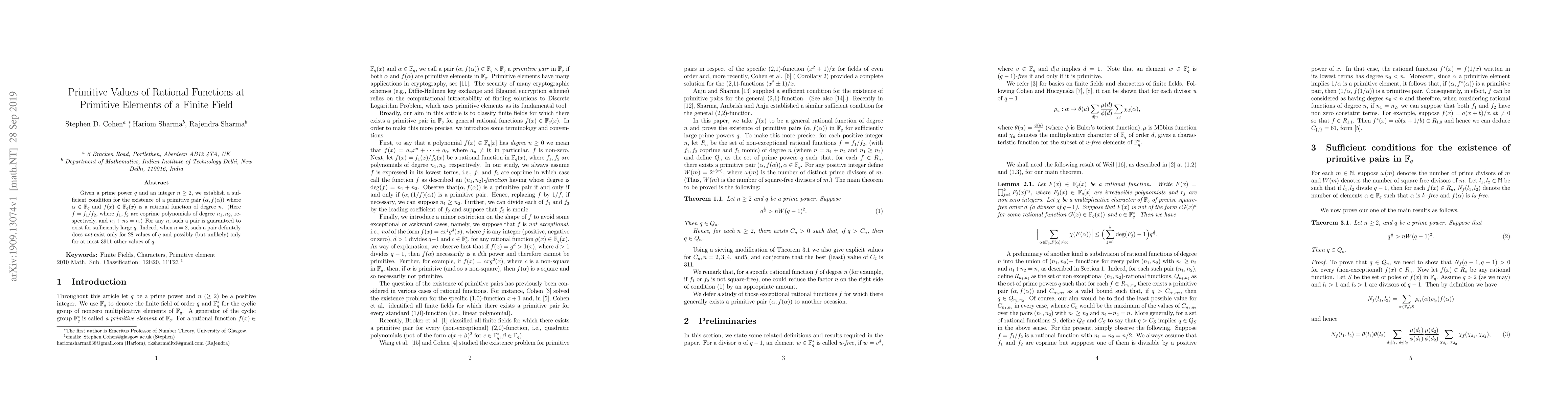 Given a prime power $q$ and an integer $n\geq2$, we establish a sufficient condition for the existence of a primitive pair $(\alpha,f(\alpha))$ where $\alpha \in \mathbb{F}_q$ and $f(x) \in \mathbb{F}_q(x)$ is a rational function of degree $n$. (Here $f=f_1/f_2$, where $f_1, f_2$ are coprime polynomials of degree $n_1,n_2$, respectively, and $n_1+n_2=n$.) For any $n$, such a pair is guaranteed to exist for sufficiently large $q$. Indeed, when $n=2$, such a pair definitely does {\em not} exist only for 28 values of $q$ and possibly (but unlikely) only for at most $3911$ other values of $q$.