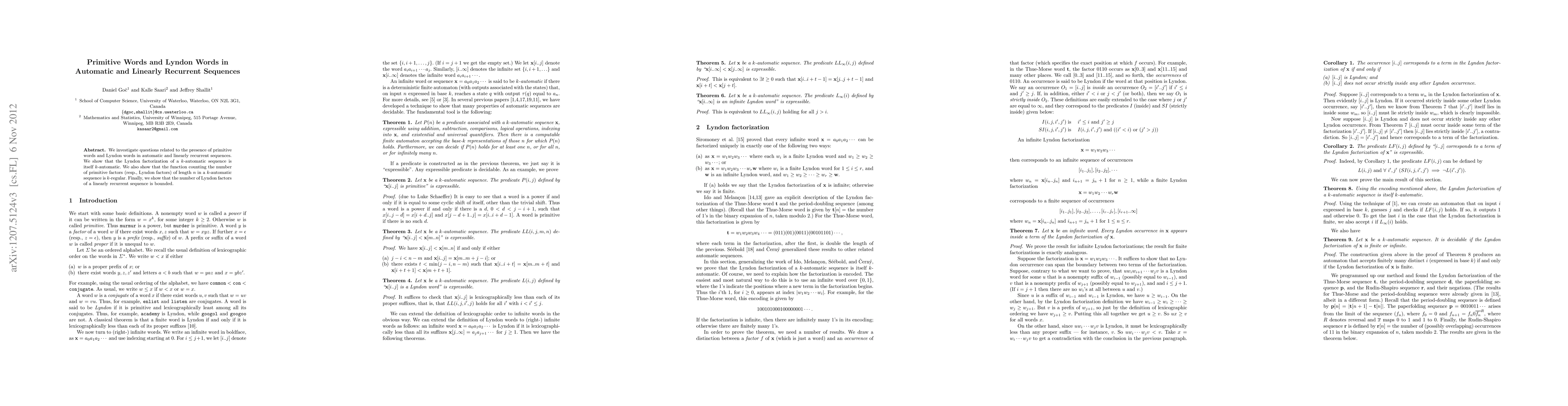 This paper examines primitive and Lyndon words within automatic and linearly recurrent sequences, demonstrating that Lyndon factorization in k-automatic sequences remains k-automatic and that the count functions for primitive and Lyndon factors in k-automatic sequences are k-regular. Additionally, it establishes a bound on the number of Lyndon factors in linearly recurrent sequences.
