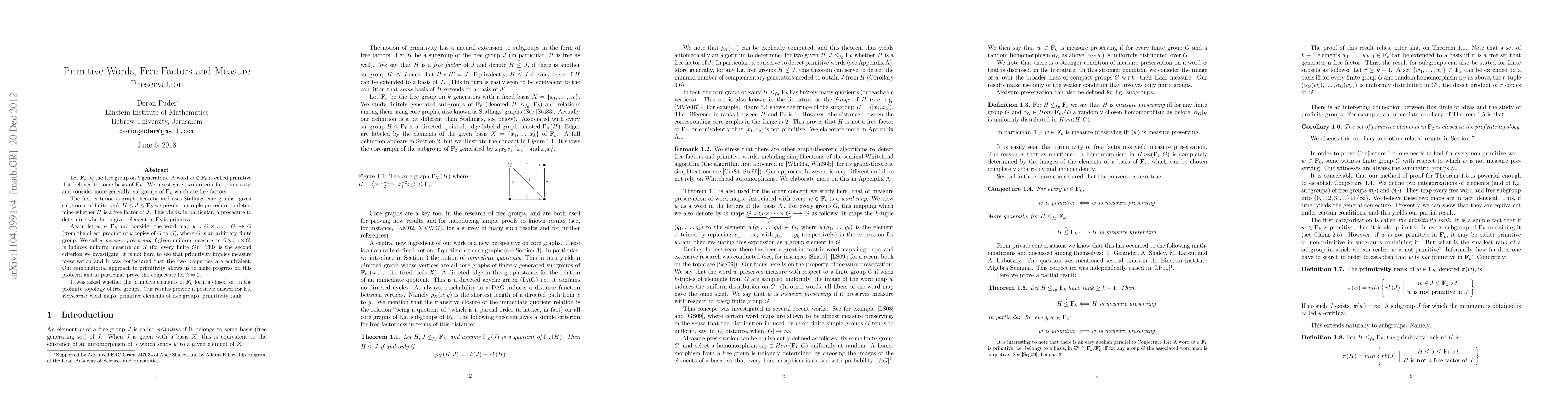 Let F_k be the free group on k generators. A word w \in F_k is called primitive if it belongs to some basis of F_k. We investigate two criteria for primitivity, and consider more generally, subgroups of F_k which are free factors. The first criterion is graph-theoretic and uses Stallings core graphs: given subgroups of finite rank H \le J \le F_k we present a simple procedure to determine whether H is a free factor of J. This yields, in particular, a procedure to determine whether a given element in F_k is primitive. Again let w \in F_k and consider the word map w:G x G x ... x G \to G (from the direct product of k copies of G to G), where G is an arbitrary finite group. We call w measure preserving if given uniform measure on G x G x ... x G, w induces uniform measure on G (for every finite G). This is the second criterion we investigate: it is not hard to see that primitivity implies measure preservation and it was conjectured that the two properties are equivalent. Our combinatorial approach to primitivity allows us to make progress on this problem and in particular prove the conjecture for k=2. It was asked whether the primitive elements of F_k form a closed set in the profinite topology of free groups. Our results provide a positive answer for F_2.