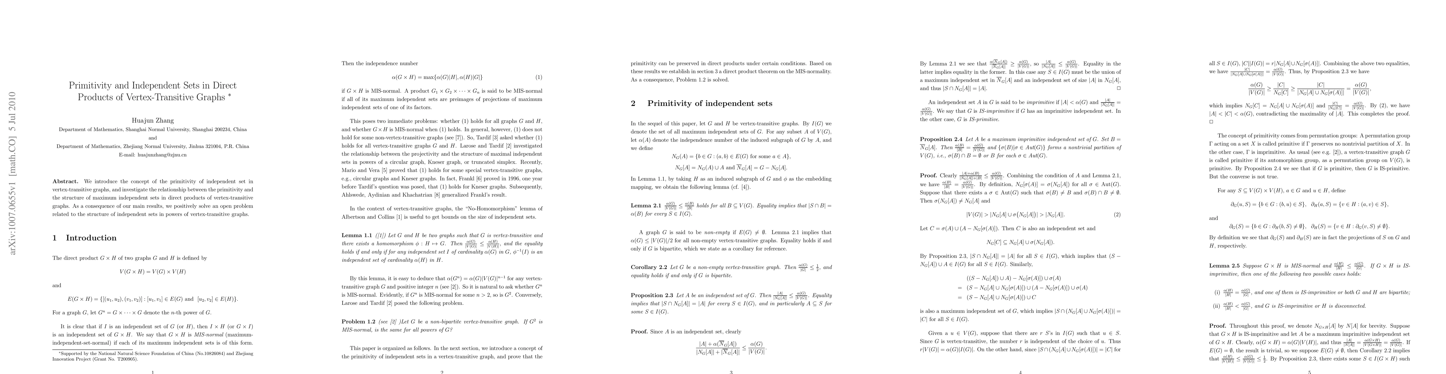 The paper explores the primitivity of independent sets in vertex-transitive graphs and examines how this relates to the structure of maximum independent sets in direct products of such graphs, solving an open problem regarding independent sets in powers of vertex-transitive graphs.