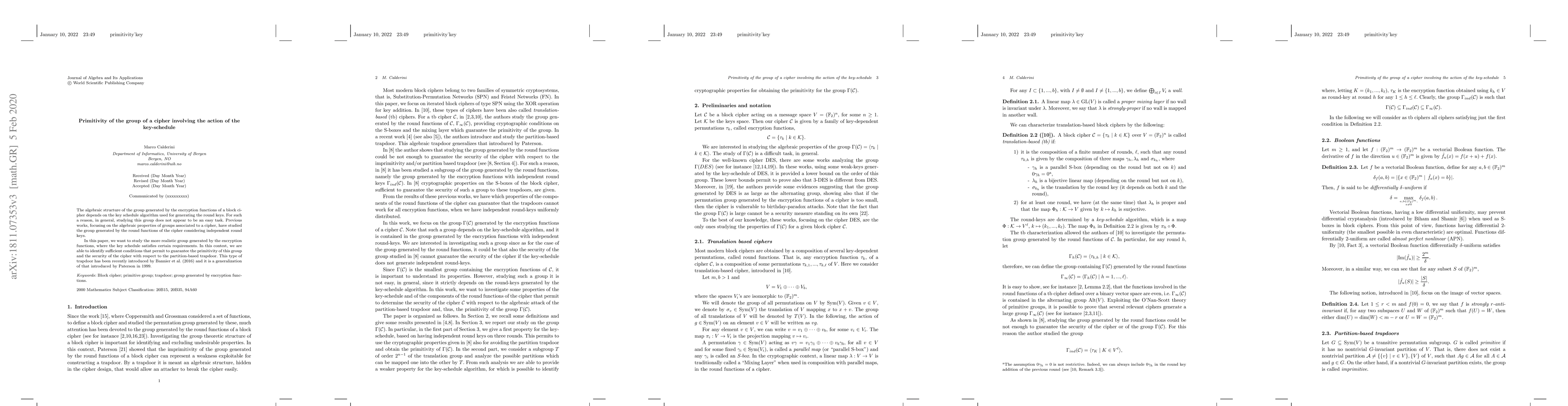 This paper investigates the algebraic structure of the group generated by the encryption functions of a block cipher, focusing on the impact of the key schedule algorithm. It identifies sufficient conditions to ensure the primitivity of this group, thereby guaranteeing the cipher's security against partition-based trapdoor attacks.
