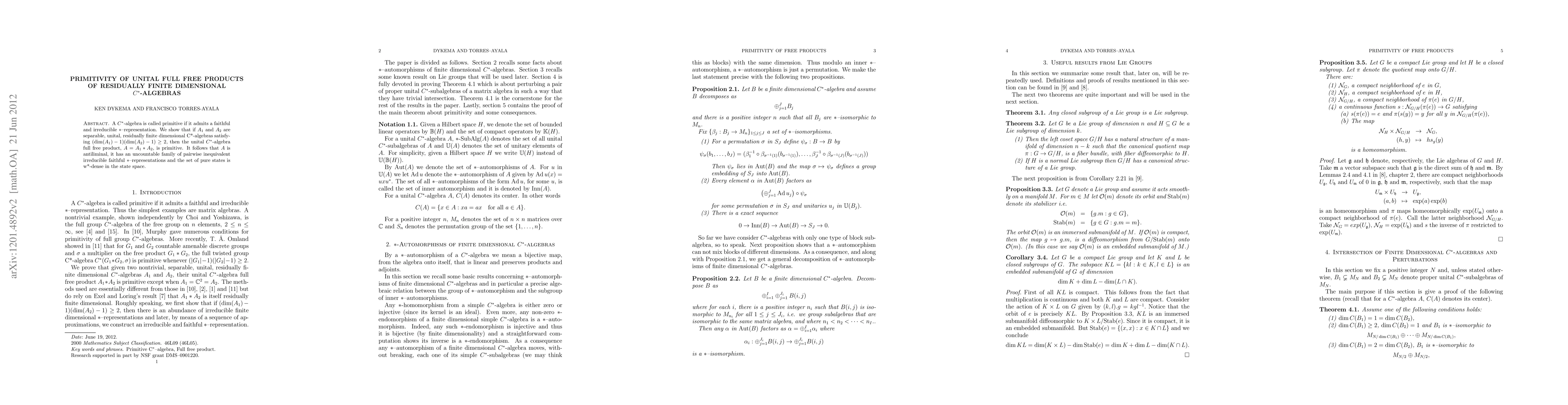 A C*-algebra is called primitive if it admits a faithful and irreducible *-representation. We show that if A_1 and A_2 are separable, unital, residually finite dimensional C*-algebras that are not both two dimensional, then their unital C*-algebra full free product, A = A_1*A_2, is primitive. It follows that A is antiliminal and the set of pure states is w*-dense in the state space.