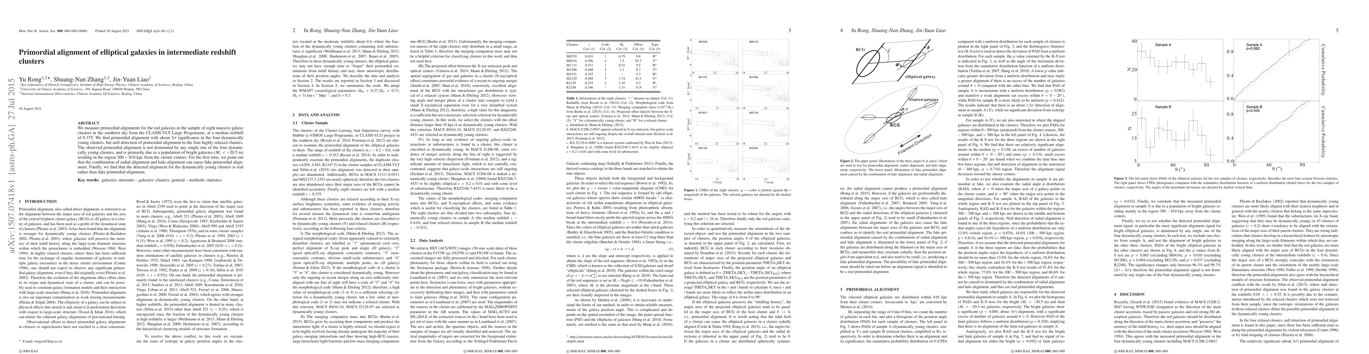 This study finds primordial alignment in 4 out of 8 massive galaxy clusters at a median redshift of 0.375, suggesting that bright galaxies are aligned with the cluster centers, while relaxation of the system leads to no such alignment.
