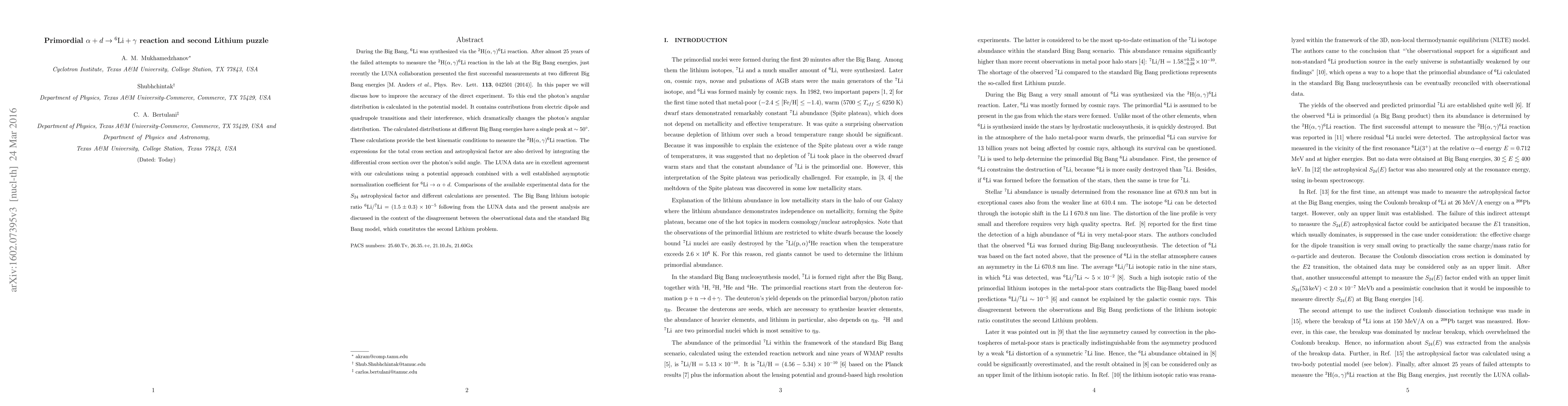 This paper discusses the recent successful laboratory measurements of the primordial ${}^{2}{\rm H}(\alpha,\gamma){}^{6}{\rm Li}$ reaction, crucial for understanding Big Bang nucleosynthesis. The authors calculate the photon's angular distribution and derive expressions for the total cross section, finding agreement with LUNA data and contributing to resolving the second Lithium puzzle.