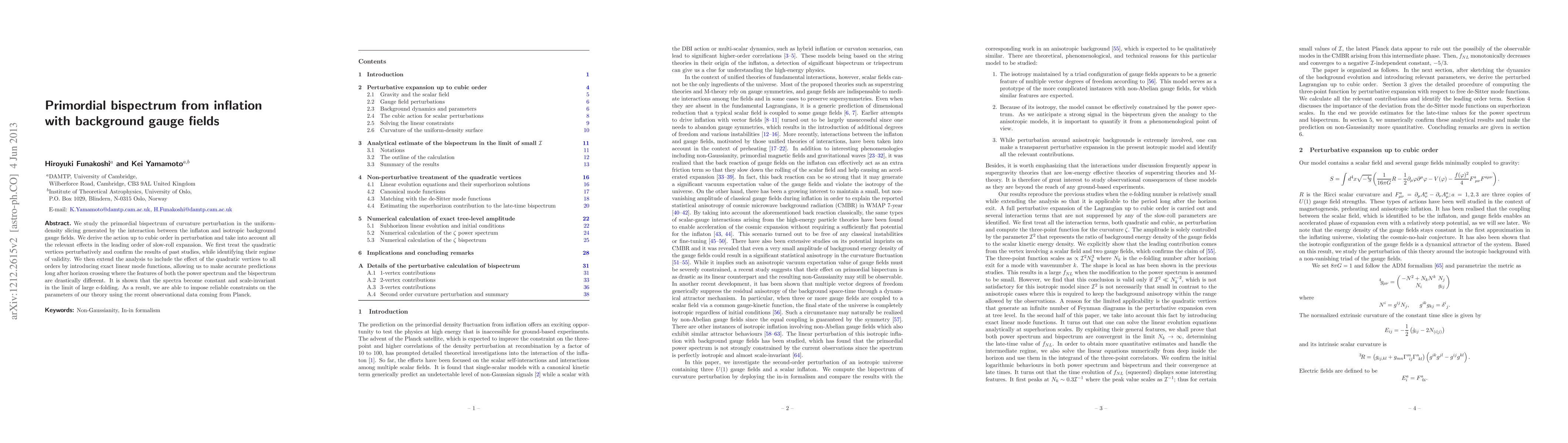 We study the primordial bispectrum of curvature perturbation in the uniform- density slicing generated by the interaction between the inflaton and isotropic background gauge fields. We derive the action up to cubic order in perturbation and take into account all the relevant effects in the leading order of slow-roll expansion. We first treat the quadratic vertices perturbatively and confirm the results of past studies, while identifying their regime of validity. We then extend the analysis to include the effect of the quadratic vertices to all orders by introducing exact linear mode functions, allowing us to make accurate predictions long after horizon crossing where the features of both the power spectrum and the bispectrum are drastically different. It is shown that the spPPectra become constant and scale-invariant in the limit of large e-folding. As a result, we are able to impose reliable constraints on the parameters of our theory using the recent observational data coming from Planck.