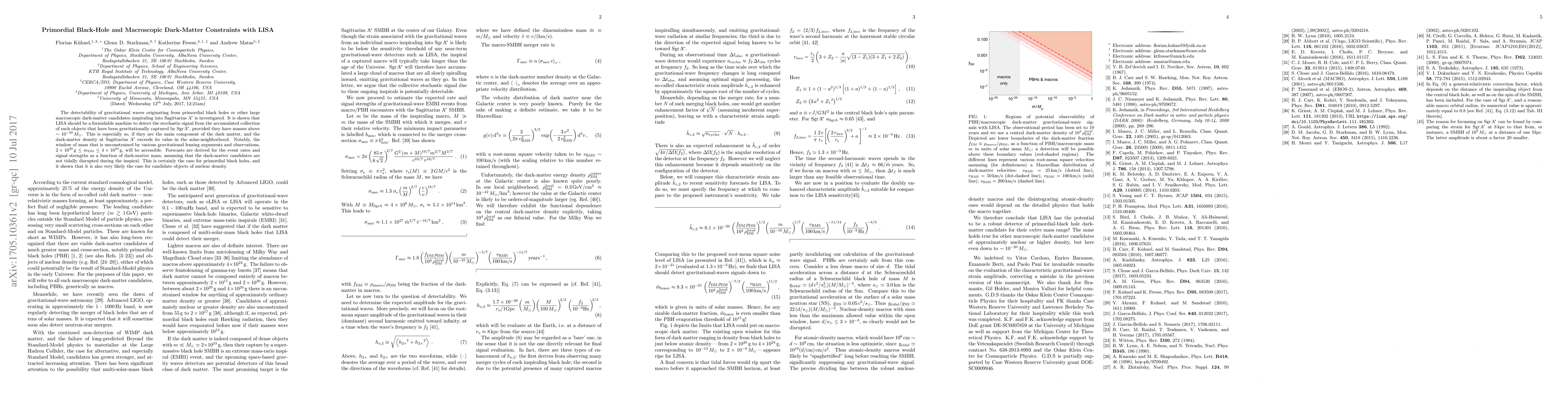 This paper investigates LISA's potential to detect gravitational waves from primordial black holes and large dark-matter objects spiraling into Sagittarius A*. It concludes that LISA can detect these objects if they constitute a significant portion of dark matter and are within a mass range unconstrained by other observations.